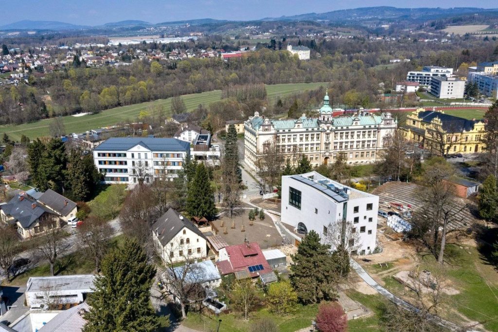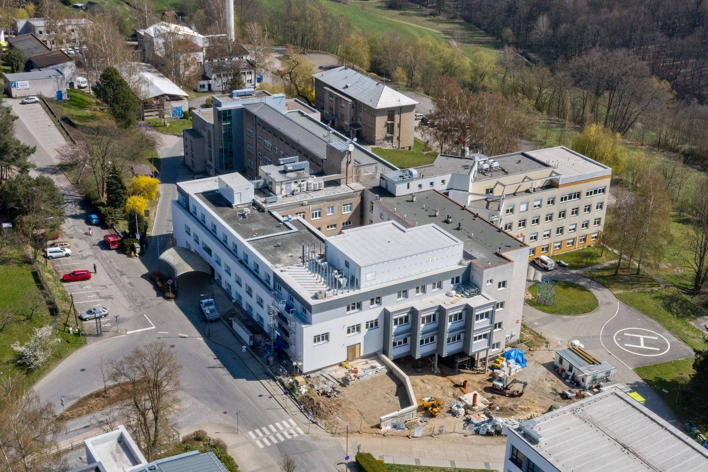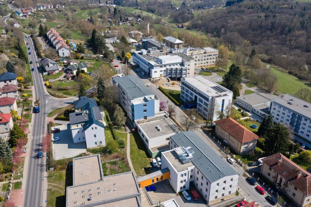 Přístavba ambulantního traktu turnovské nemocnice přijde na 156 mil. Kč. Hotovo bude letos na podzim. Na snímku je areál nemocnice spolu s Domovem Důchodců Pohoda a Střední zdravotnickou školou.