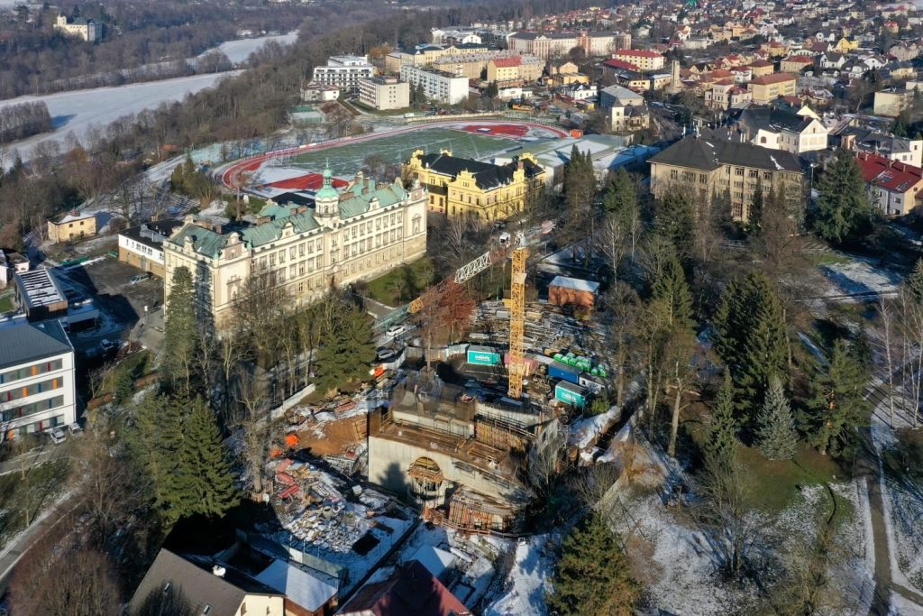 Do hotových podlaží byla minulý týden osazena betonová prefabrikovaná schodiště. „V suterénu jsou již provedeny příčky v místě sociálního zázemí a v technické části. Dále jsou v suterénu dokončovány venkovní izolace stěn, které budou později schovány pod terénem,“ doplnil Bičík. Dokončená je také nová stěna v historickém sklepení, aby mohla být později odbourána část, která překáží knihovně.