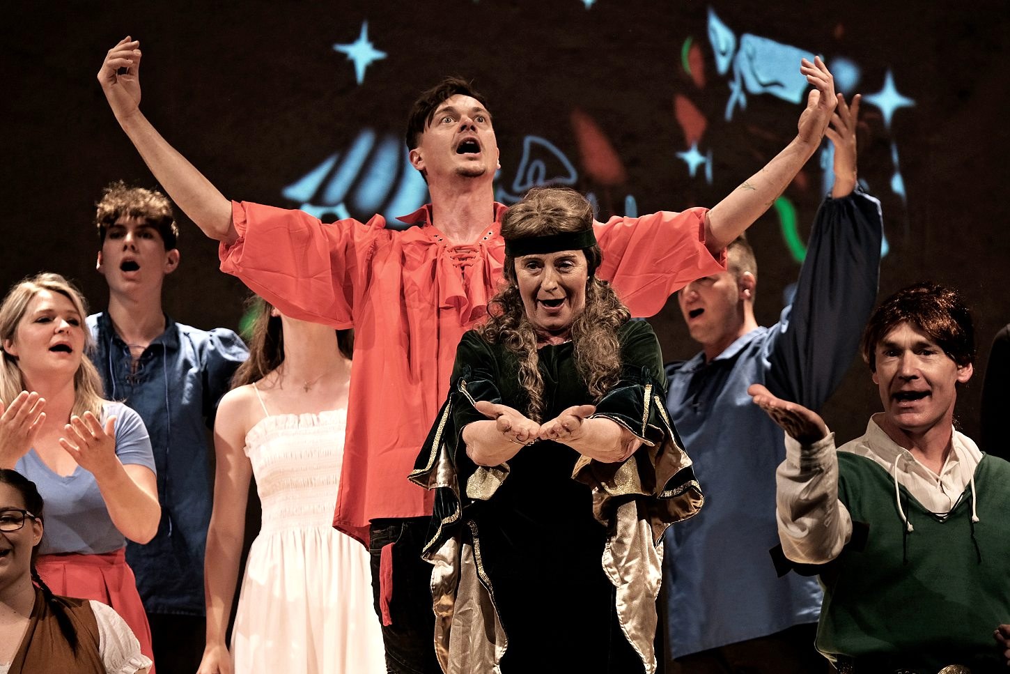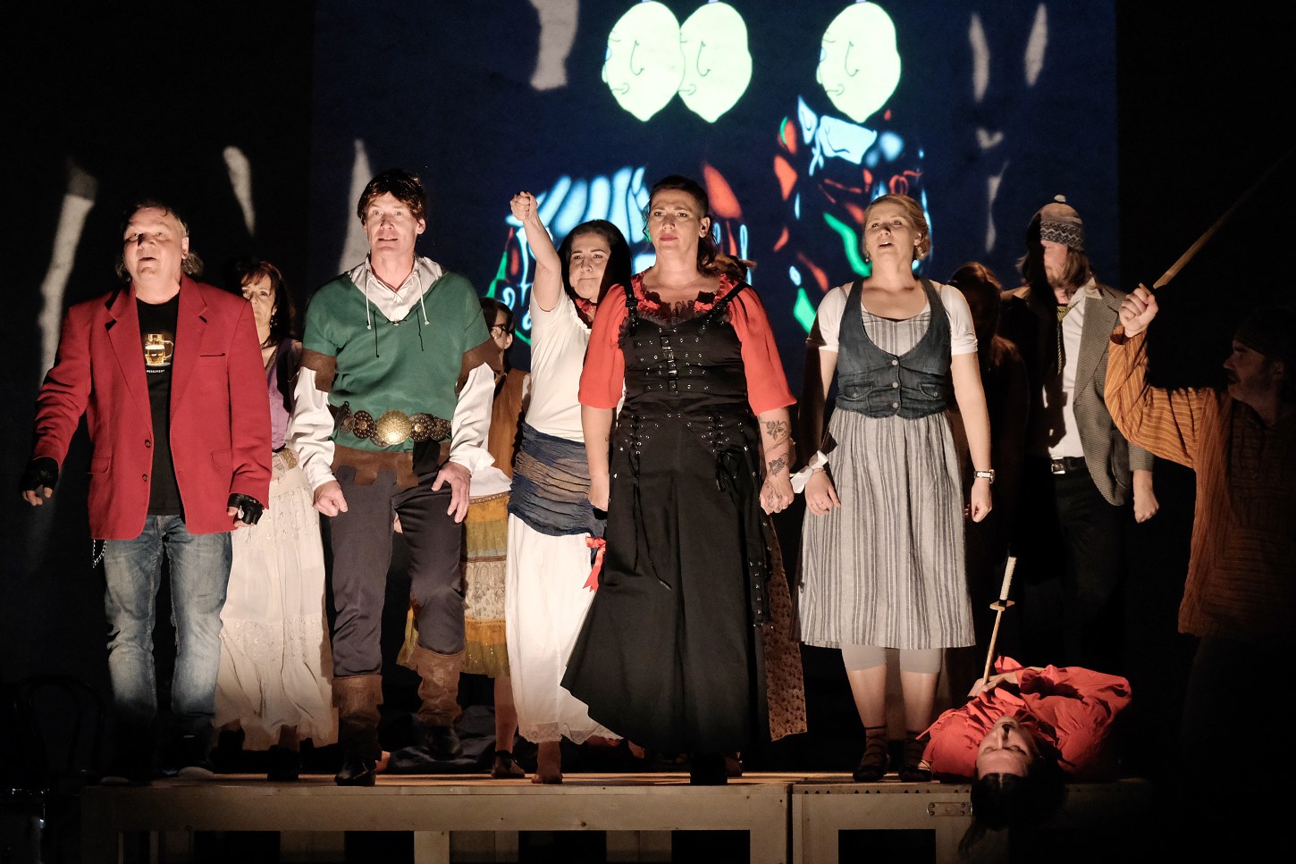Petru Hakenovi, známému turnovskému divadelníkovi, se podařilo jako autorovi ke spolupráci na představení přizvat hudebního skladatele Martina Hyblera (je to přec jen divadelní hra se zpěvy), část Pěveckého sboru Musica Fortuna, několik místních ochotnických herců i neherců, kdy třeba faráře hraje Ivan Kunetka a onu vědmu knihovnice Eva Kordová, která mimochodem celou sobotu uváděla Staročeské trhy a večer si jen tak odběhla do divadla věštit budoucnost města. A v neděli byla opět na trzích!