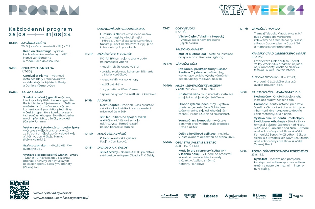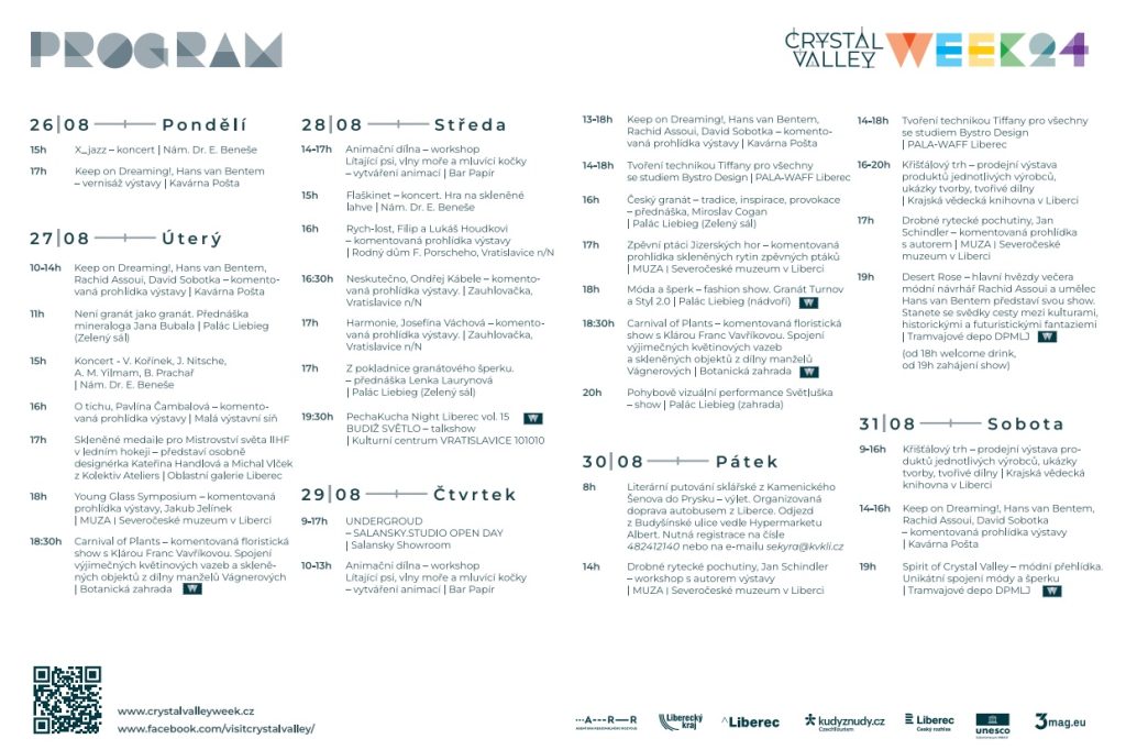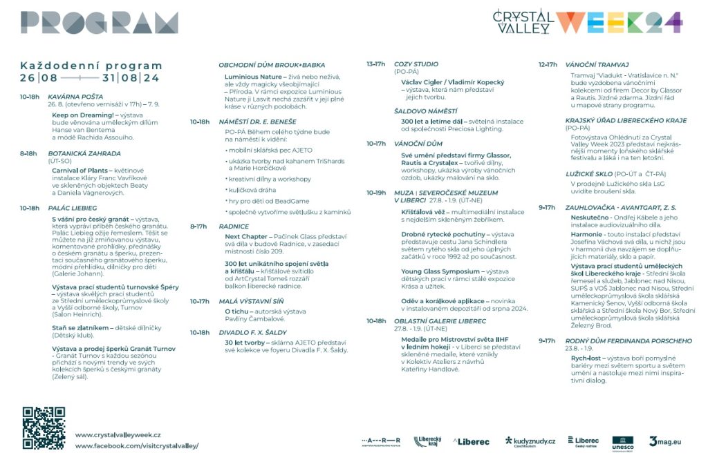 Velká letní přehlídka skla, šperku a bižuterie z celého Křišťálového údolí rozzáří Liberec v posledním srpnovém týdnu. Třetí ročník sklářského festivalu přinese zajímavé výstavy, venkovní instalace, ukázky výroby skla a šperků i módní přehlídky, to vše od pondělí 26. do soboty 31. srpna. Každý den se něco děje – viz přehled na konci článku, resp. na https://crystalvalleyweek.cz a Facebookovém profilu Visit Crystal Valley.
