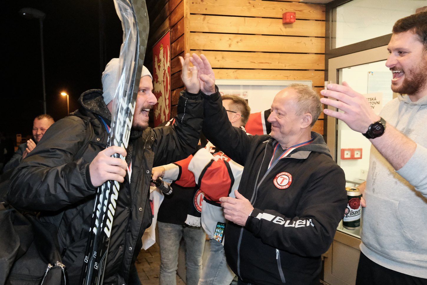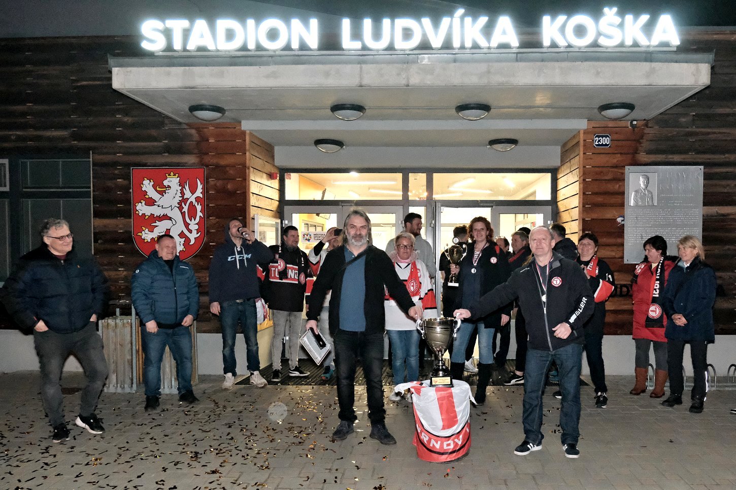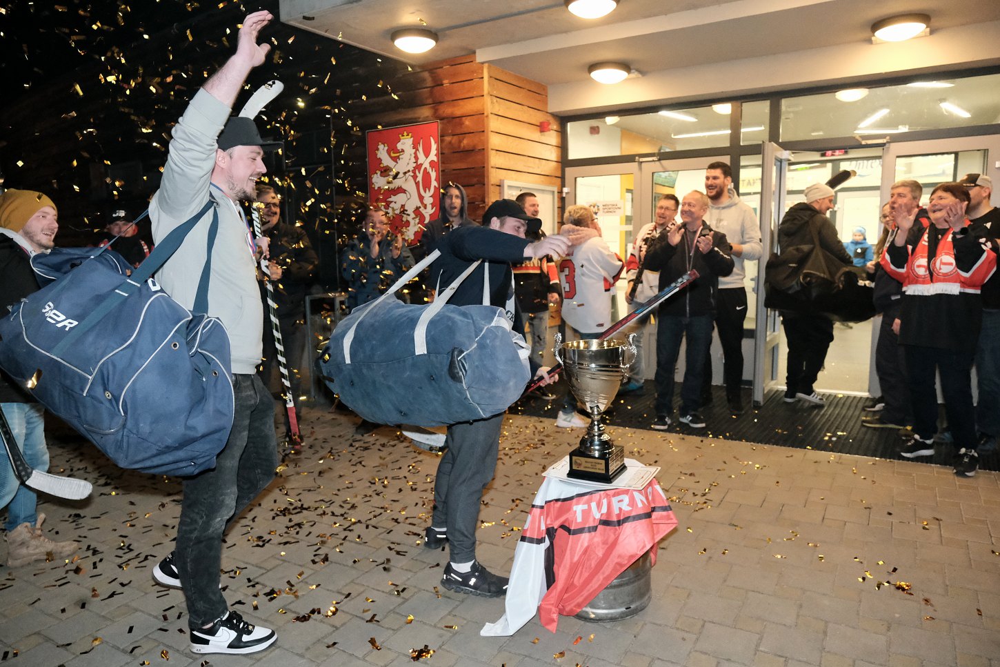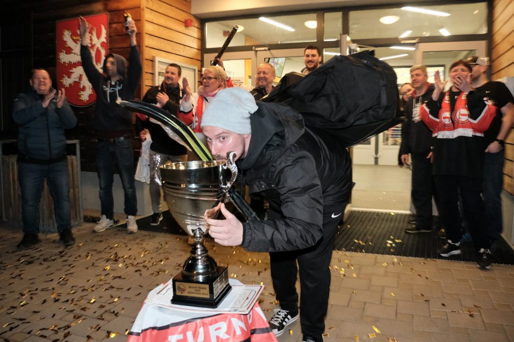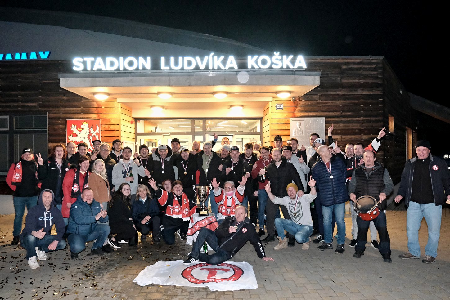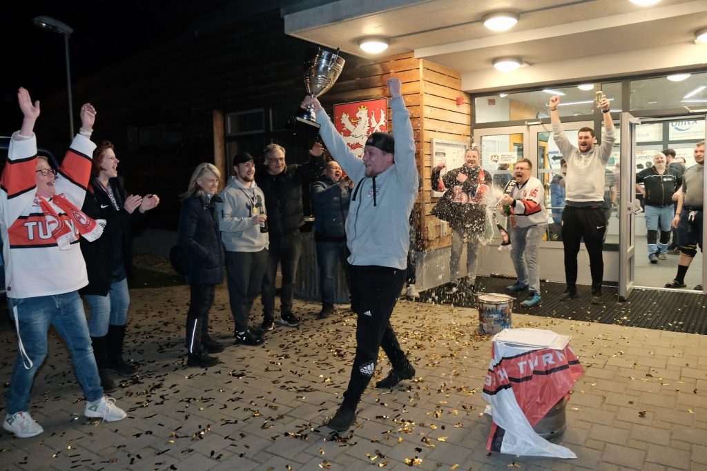 Ti se začali před turnovským stadionem scházet hned, jak se dozvěděli výsledek utkání v Jičíně. Kolem 21. hodiny začali postupně přijíždět jednotliví hráči a trenéři. Došlo na společný snímek před turnovským „zimákem“ a následně ještě s pohárem na hrací ploše. Tady to bylo navíc ještě symbolické. V neděli 19. března skočila na turnovském zimní stadionu sezona. Letos o něco dřív z důvodu nárůstu cen energií…