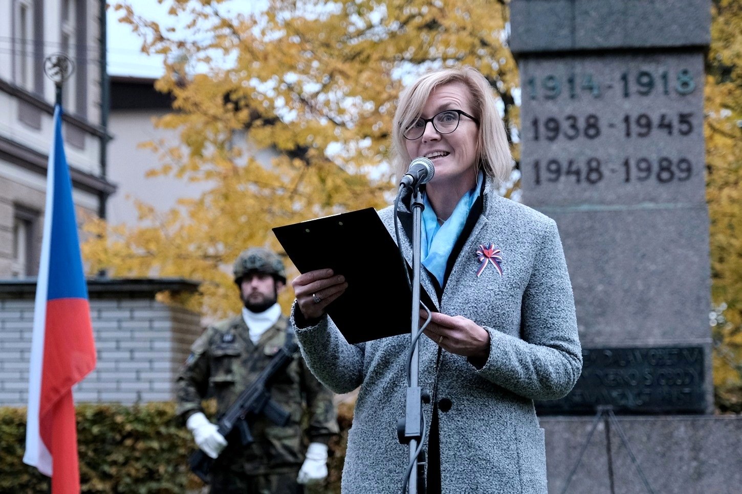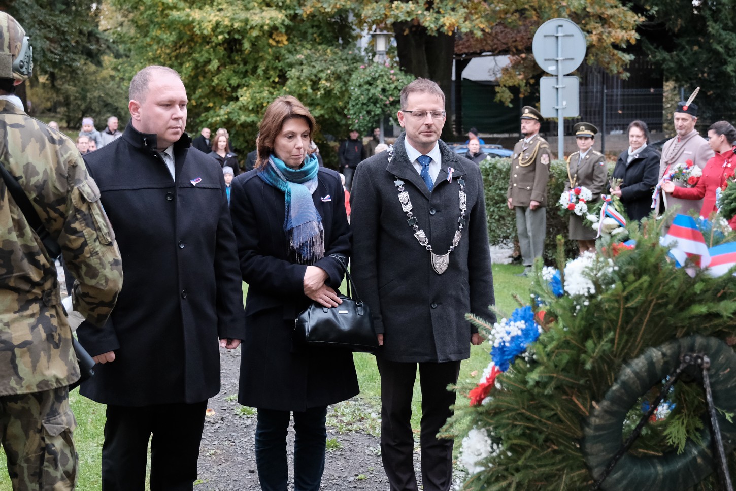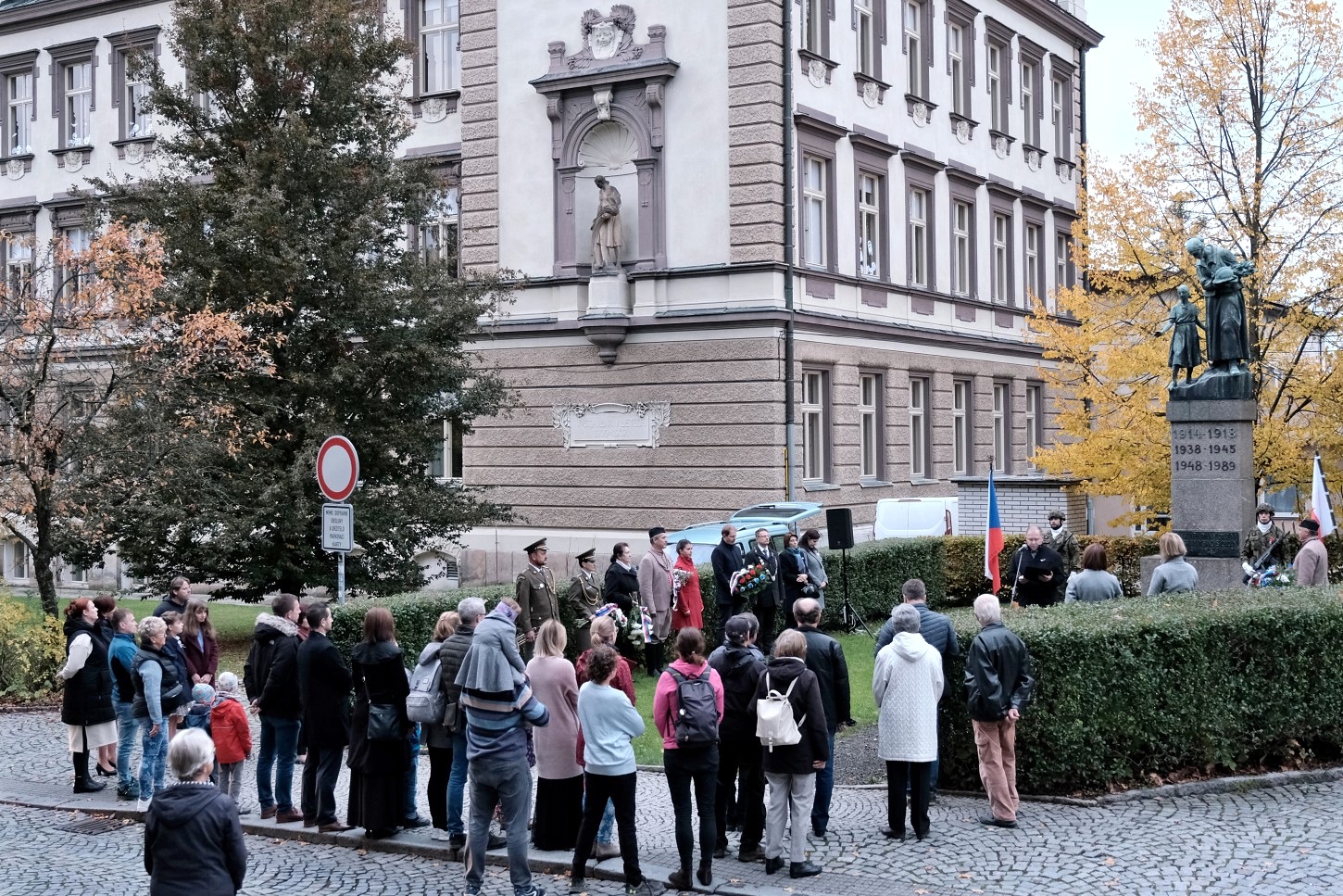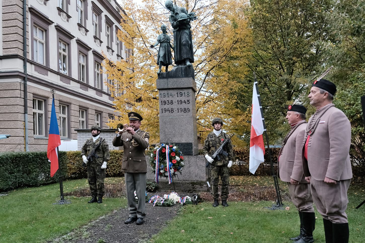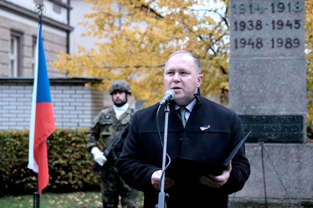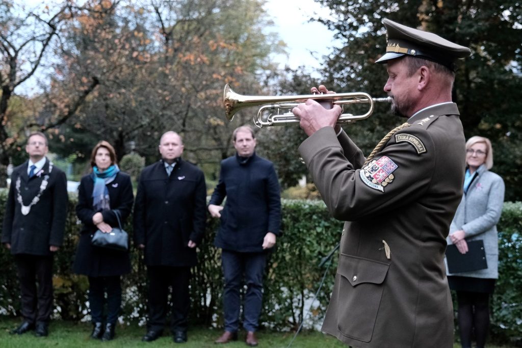 Tradiční setkání u pomníku spojené s kladením věnců a proslovem zástupce města. Letos padla volba na místostarostu Jana Lochmana. „Historie – a bohužel i ta velmi nedávná – nám neustále dokazuje, že svoboda je křehký poklad, o který je třeba pečovat a za který se vyplatí bojovat. Před sto pěti lety jsme dosáhli samostatnosti a svobody, ale tato svoboda byla brzy zasažena válkou a totalitními režimy. Naši předci se museli vzepřít těmto temným silám a obětovat sebe samé, aby zajistili, že následující generace budou moci žít v míru. Musíme si být vědomi, že naše úsilí o udržení svobody a demokracie není nikdy ukončeno. Měli bychom se poučit z minulosti a nepodcenit hodnotu svobody, kterou si náš národ vybojoval,“ uvedl mj. místostarosta.
