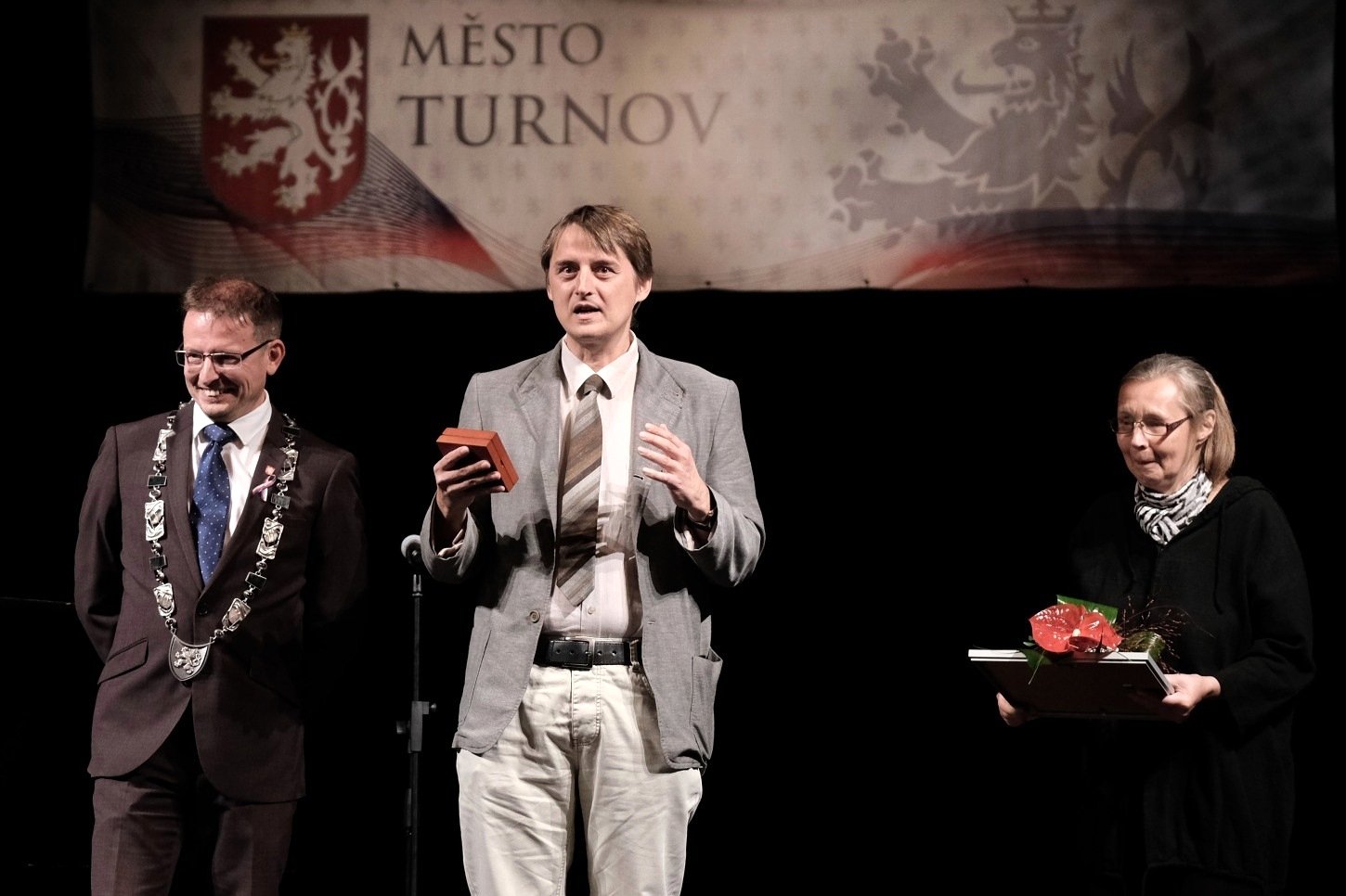 Dnes, při uctění svátku 105. výročí vzniku naší republiky, máme společně tu čest, abychom možná v trochu ponuré společenské náladě rozsvítili světla, která nám obrazně představují oceňované osobnosti záchranářů, trenéra dětí a mládeže, sbormistryně či významné turnovské firmy, která provází naše město již 70 let. Světla naděje a světla hodná následování.“