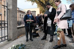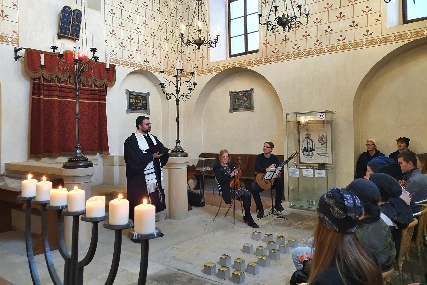 Ve 12.30 hodin začal v synagoze v Krajířově ulici slavnostní pietní akt, ve kterém rabín pronesl modlitbu za pokojné spočinutí zesnulých El male rachamim. Všech 16 kamenů s mosazným povrchem se jménem, datem narození, rokem