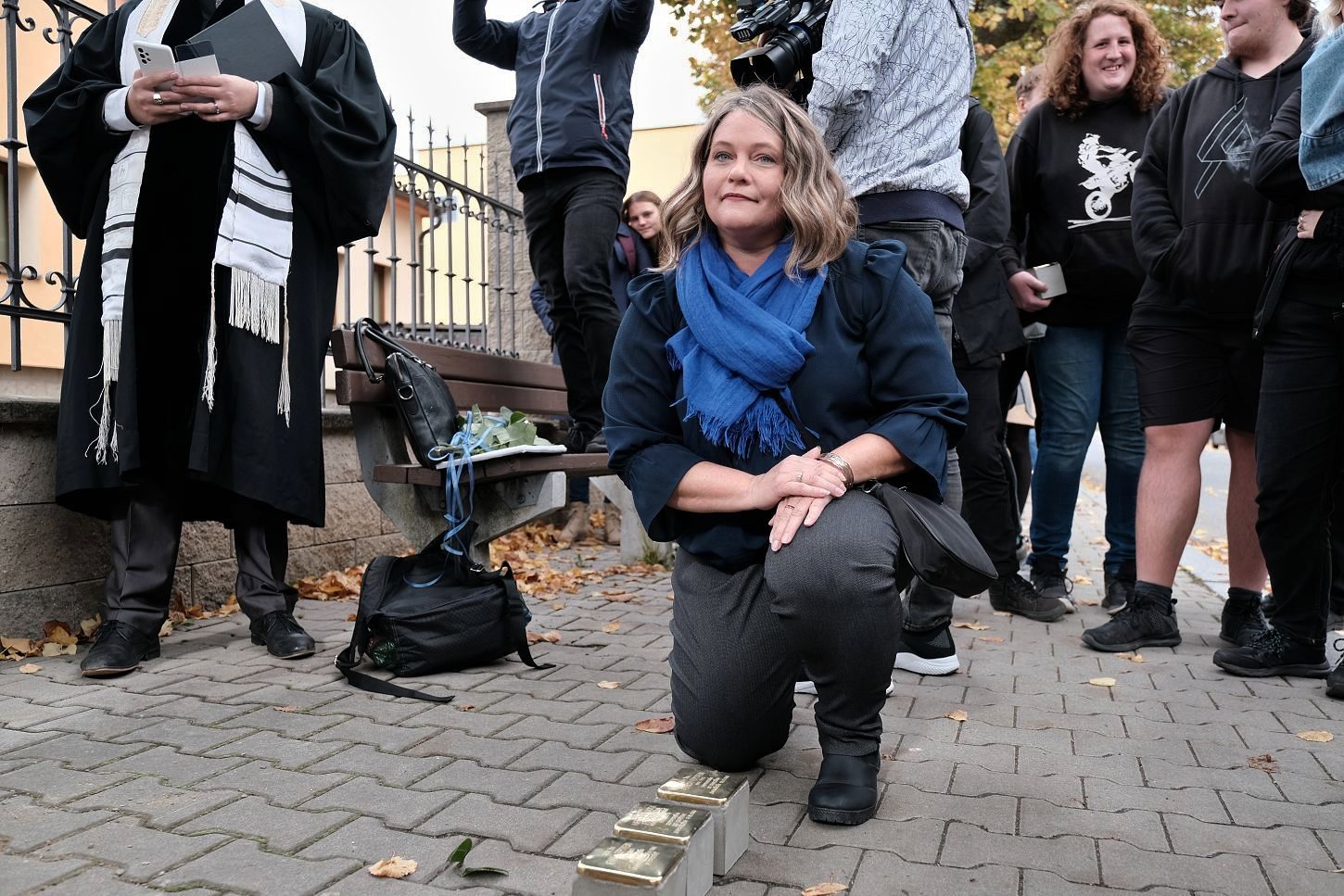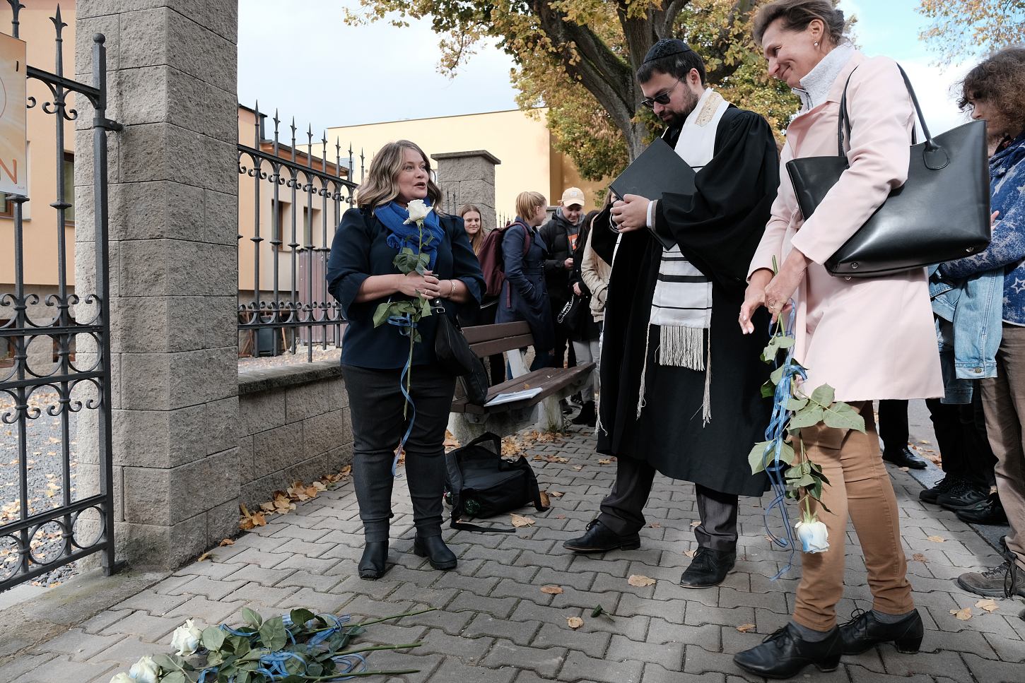 a místem násilné smrti jeho nositele v nacistickém koncentračním táboře bylo rozloženo na místě bývalé bimy (důležité místo uprostřed synagogy). Pan rabín zdůraznil, že slovo Stolperstein pochází z německých slov stolpern, která znamená „zakopnout“, a stein, což je v překladu do češtiny „kámen“.