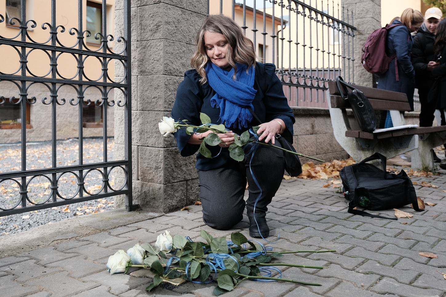 že dnes umisťujeme kameny zmizelých za turnovské Židy, zajišťujeme, že jejich jména nebudou zapomenuta. Těm, kteří byli zavražděni a ponecháni bez místa posledního odpočinku, dnes umisťujeme památník na místě, kde žili své životy. Dáváme tak najevo, že měli své místo v tomto domě a v tomto městě a že jej v naší paměti budou mít navždy. Věřím, že kromě toho všichni doufáme, že se Stolpersteiny stanou mementem toho, co dokáže lidská nenávist, když se spojí s lhostejností.“ Krásný hudební doprovod zajistili učitelé zdejší základní umělecké školy Šárka Košťálová (housle) a Petr Kostka (kytara).