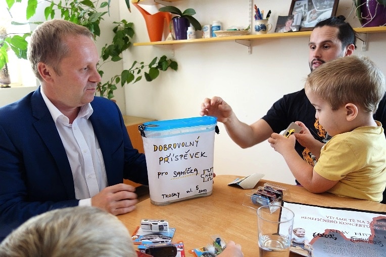 Přes 50 tisíc korun, které se podařilo pro zdravotně postiženého Samuela vybrat na konci srpna na benefičním metalovém koncertě na hradě Trosky (ZDE), přivezl v zapečetěné kasičce rodině do obce Sezemice jeden z hlavních organizátorů, muzikant Jakub Viták. Za rodinou se vypravil také náměstek hejtmana Libereckého kraje pro sociální oblast Pavel Svoboda. Ten přivezl jako dárek chlapci sadu modelů autíček, takzvaných angličáků.