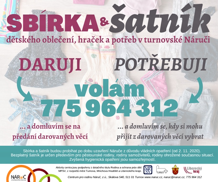 Turnovská Náruč tradičně dvakrát do roka vždy na jaře a na podzim organizuje bazárek a sbírku dětského oblečení a potřeb. Věci putují většinou do pěstounských rodin, charitativních organizací, dětských domovů. Původně na říjen plánovaná týdenní akce ale nakonec vzala za své z důvodu vládních opatření. Jestli ale něco v Náruči neumíme, tak je to sedět s rukama složenýma v klíně.