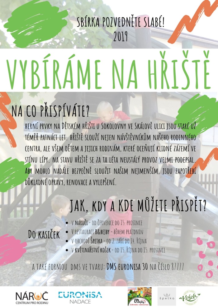Během okurkové sezony jsme stihli absolvovat pobytový tábor pro rodiče s dětmi v Pleskotech, čtyři turnusy táborů příměstských a jeden týden výtvarné dílny v knihovně na nádraží. Do restaurace BBejby jsme instalovali pokladničku pro sbírku „Pozvedněte slabé!“ Nadace Euronisa – vybíráme na opravu našeho venkovního hřiště. Nadále zůstáváme zapojeni do kampaně „Zachovejte centra“ – rodinným centrům aktuálně vyjádřil podporu náměstek hejtmana Libereckého kraje Pavel Svoboda.