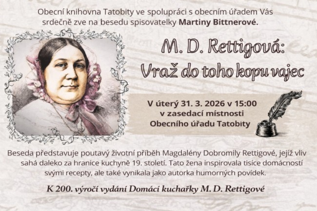 * Obecní knihovna Tatobity ve spolupráci s obecním úřadem zvou na besedu se spisovatelkou Martinou Bitterovou, nazvanou M. D. RETTIGOVÁ? VRAŽ DO TOHO KOPU VAJEC. Beseda se uskuteční od 15.00 hodin v zasedací místnosti obecního úřadu. Beseda se uskuteční k 200. výročí prvního vydání legendární kuchařky.