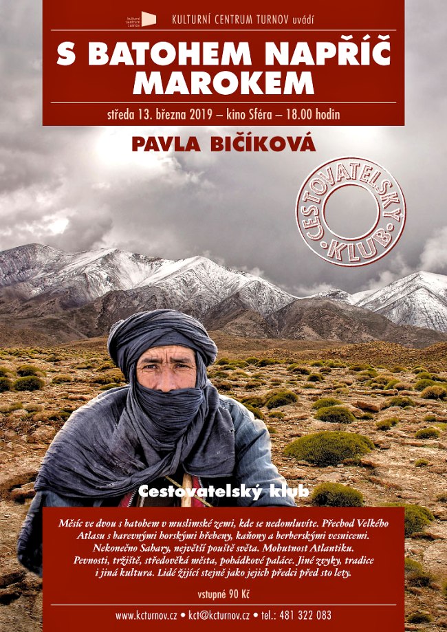 * S BATOHEM NAPŘÍČ MAROKEM. Prostřednictvím fotografií, videí a vyprávění se vydáme do exotické země plné barev, vůní a stylů. Cestovatelský klub s Pavlou Bičíkovou. Kino Sféra od 18.00 hodin. Vstupné 90 Kč.
