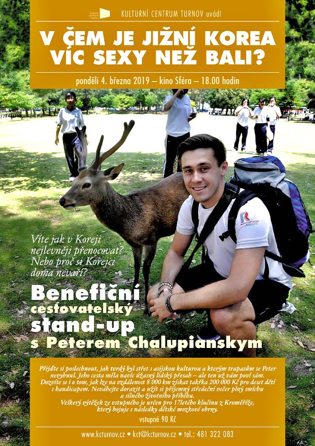 * V ČEM JE JIŽNÍ KOREA VÍC SEXY NEŽ BALI? Mladý filantrop Peter Chalupianský v pondělí 4. března rozesměje kino Sféra. Je mu teprve 27 let a již dokázal získat téměř 2 000 000 Kč pro desítky lidí s handicapem. Vydal populární knížku Odposlechnuto v Praze, odeslal přes 1 000 ručně psaných pohlednic a uspořádal více než 50 cestovatelských stand-up po celé České republice. Přijďte si poslechnout netradičně pojaté a především veselé vyprávění z jeho studií v Jižní Koreji, Filipínách a Japonsku. Výtěžek ze vstupného je určen pro 17letého klučinu z Kroměříže, který bojuje s následky dětské mozkové obrny. Benefiční cestovatelský stand-up. Kino Sféra od 18.00 hodin. Vstupné 90 Kč.