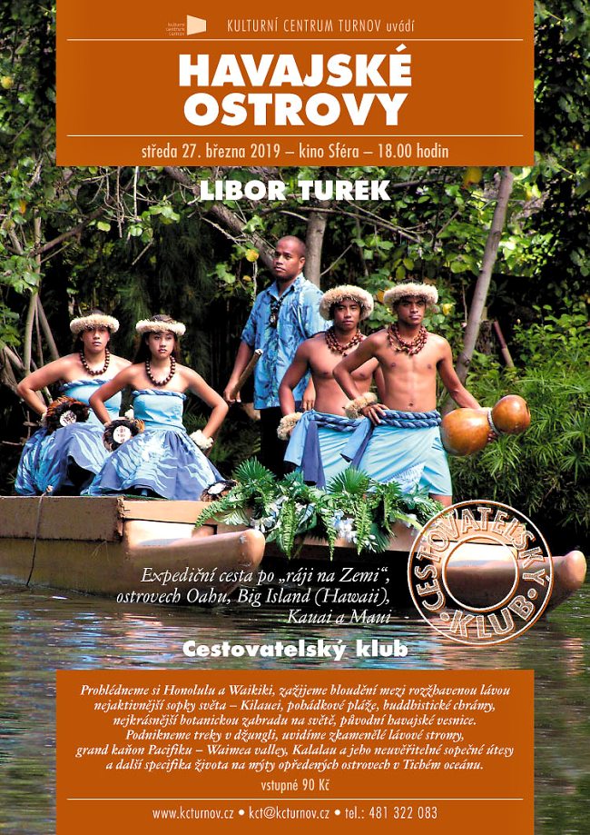* HAVAJSKÉ OSTROVY. Expediční cesta po „ráji na Zemi“, ostrovy Oahu, Big Island (Hawaii), Kauai, Maui. Prohlédneme si Honolulu a Waikiki, zažijeme bloudění mezi rozžhavenou lávou nejaktivnější sopky světa – Kilauei, pohádkové pláže, buddhistické chrámy… Cestovatelský klub s Liborem Turkem. Kino Sféra od 18.00 hodin. Vstupné 90 Kč.