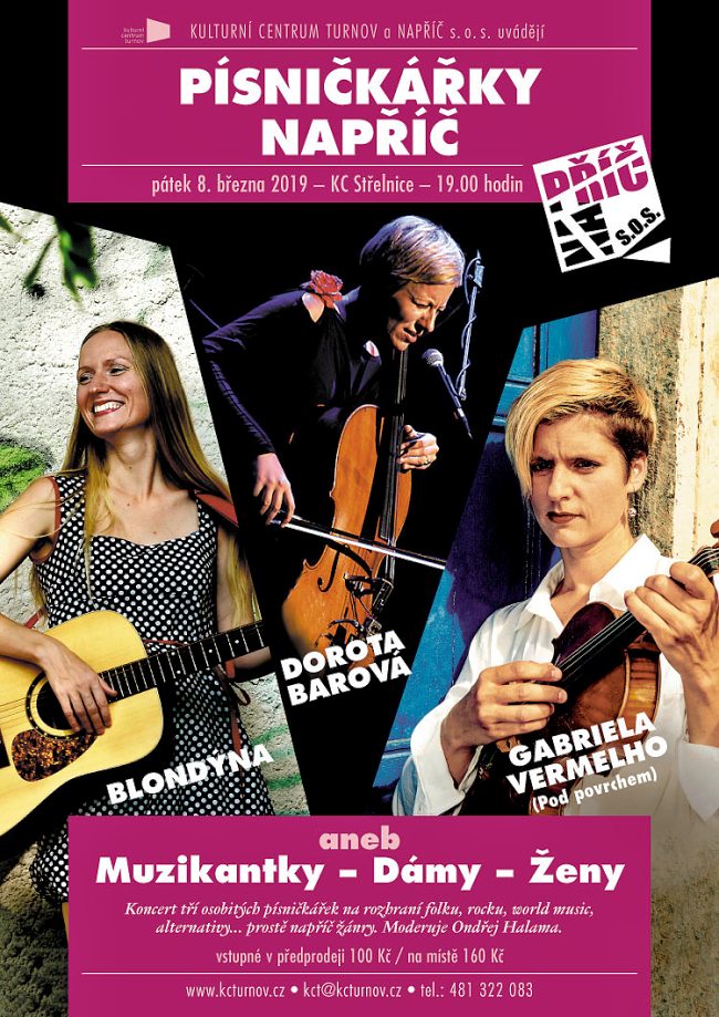 * MUZIKANTKY NAPŘÍČ ŽÁNRY ANEB MUZIKANTKY DÁMY ŽENY. Sdružení Napříč a Kulturní centrum Turnov zvou na další výhradně „ženský“ koncert MDŽ. Představí se tři osobité písničkářky na rozhraní folku, rocku, world music a alternativy.