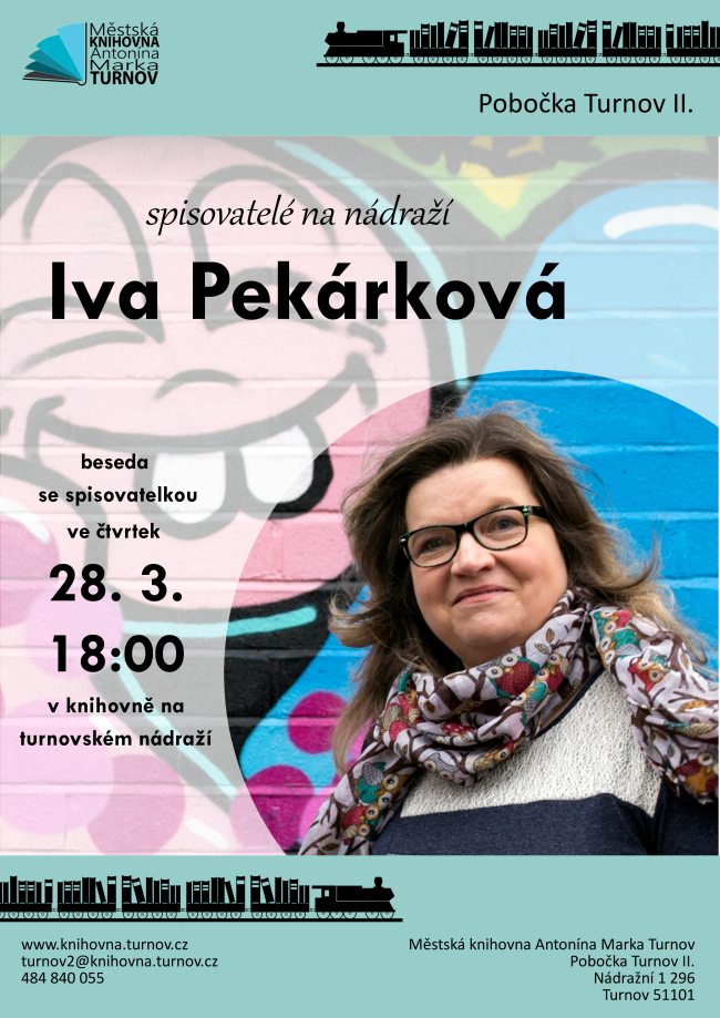 * SPISOVATELÉ NA NÁDRAŽÍ: IVA PEKÁRKOVÁ. Populární česká spisovatelka žijící v Londýně se představí čtenářům na nové pobočce knihovny na vlakovém nádraží v Turnově. Začátek v 18.00.