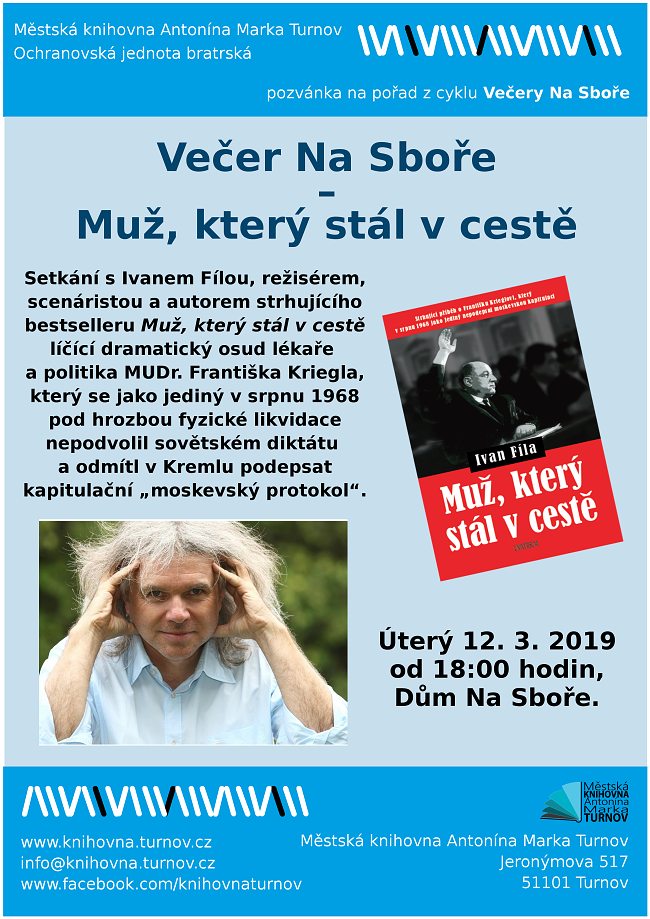 * VEČER NA SBOŘE: MUŽ, KTERÝ STÁL V CESTĚ. Zajímavé setkání s Ivanem Filou, režisérem, scénáristou, producentem a autorem strhujícího románu Muž, který stál v cestě. Pohled do života lékaře a politika Františka Kriegla. Ojedinělá kronika času předcházejícího osudné noci okupace naší vlasti v roce 1968. Dům Na Sboře ve Skálově ulici od 18.00 hodin.