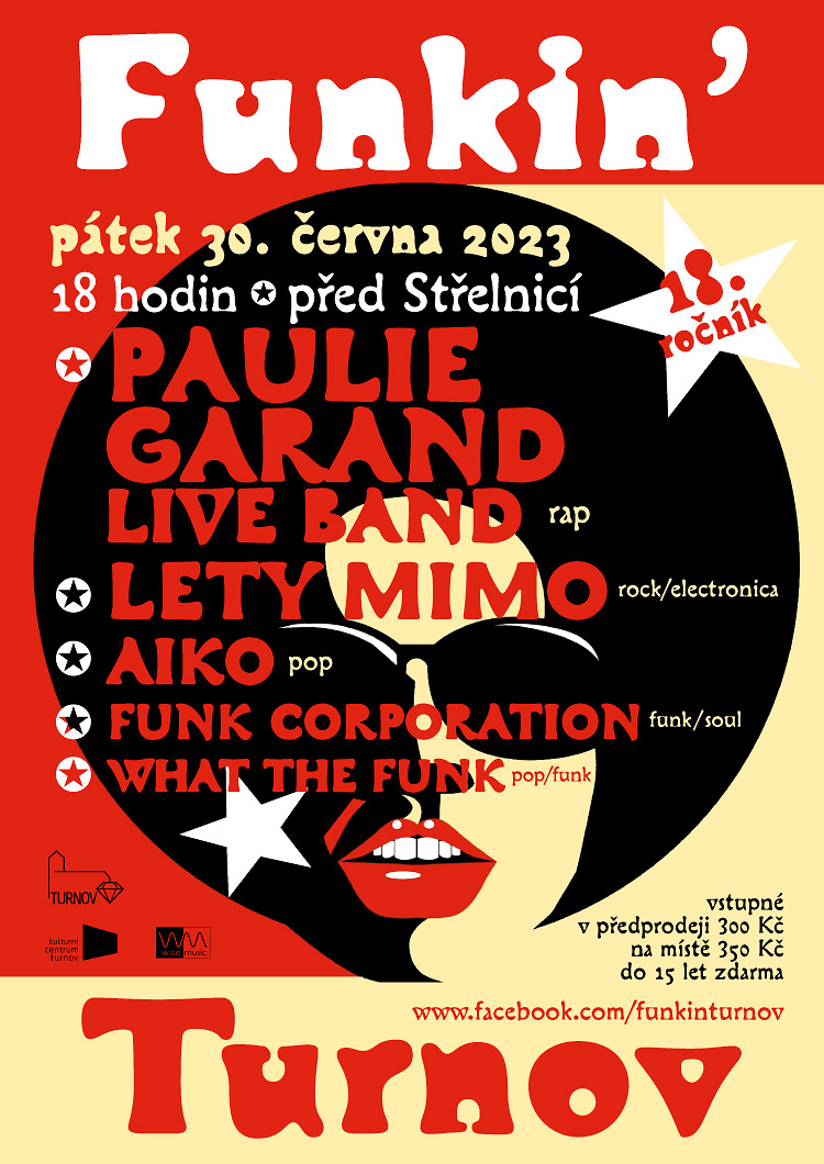 * FUNKIN᾽ TURNOV 2023. Funkový večírek se po zmařeném loňském ročníku vrací s nadupaným line-upem. Festival představí nastupující generaci turnovských funkers, kapelu What The Funk. Jedním z letošních headlinerů bude přední český raper, hip-hoper a producent Paulie Garand, který vystoupí v sestavě se živou kapelou. Jenom tři české zpěvačky se v rámci Equal hudební platformy Spotify objevily na banneru na newyorském Times Square. Jednou z nich je i zpěvačka a autorka alternativní až popové hudby Aiko. Stálicí v programu je pořádající Funk Corporation. Kapela vznikla v době, kdy většina muzikantů z What The Funk ještě nebyla na světě, ale přesto dále neúnavně šíří funkové evangelium a ani letos nepřipraví své fanoušky o nějakou novinku v repertoáru. Dalším vystupujícím je kapela Lety mimo, která vznikla v polovině „devadesátek“ na zdejší „šperkárně“. Hudební festival před Střelnicí, začátek v 18.00 hodin, vstupné v předprodeji 300 Kč.