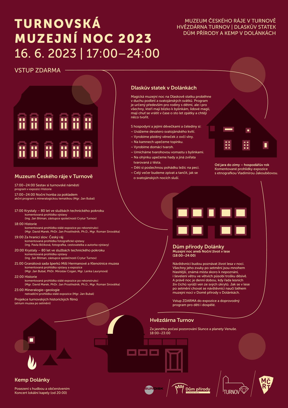 * TURNOVSKÁ MUZEJNÍ NOC 2023. Koná se v Muzeu Českého ráje ve Skálově ulici, na Dlaskově statku, v Domě přírody v Dolánkách, ve zdejším kempu a ve hvězdárně na Vrchhůře.