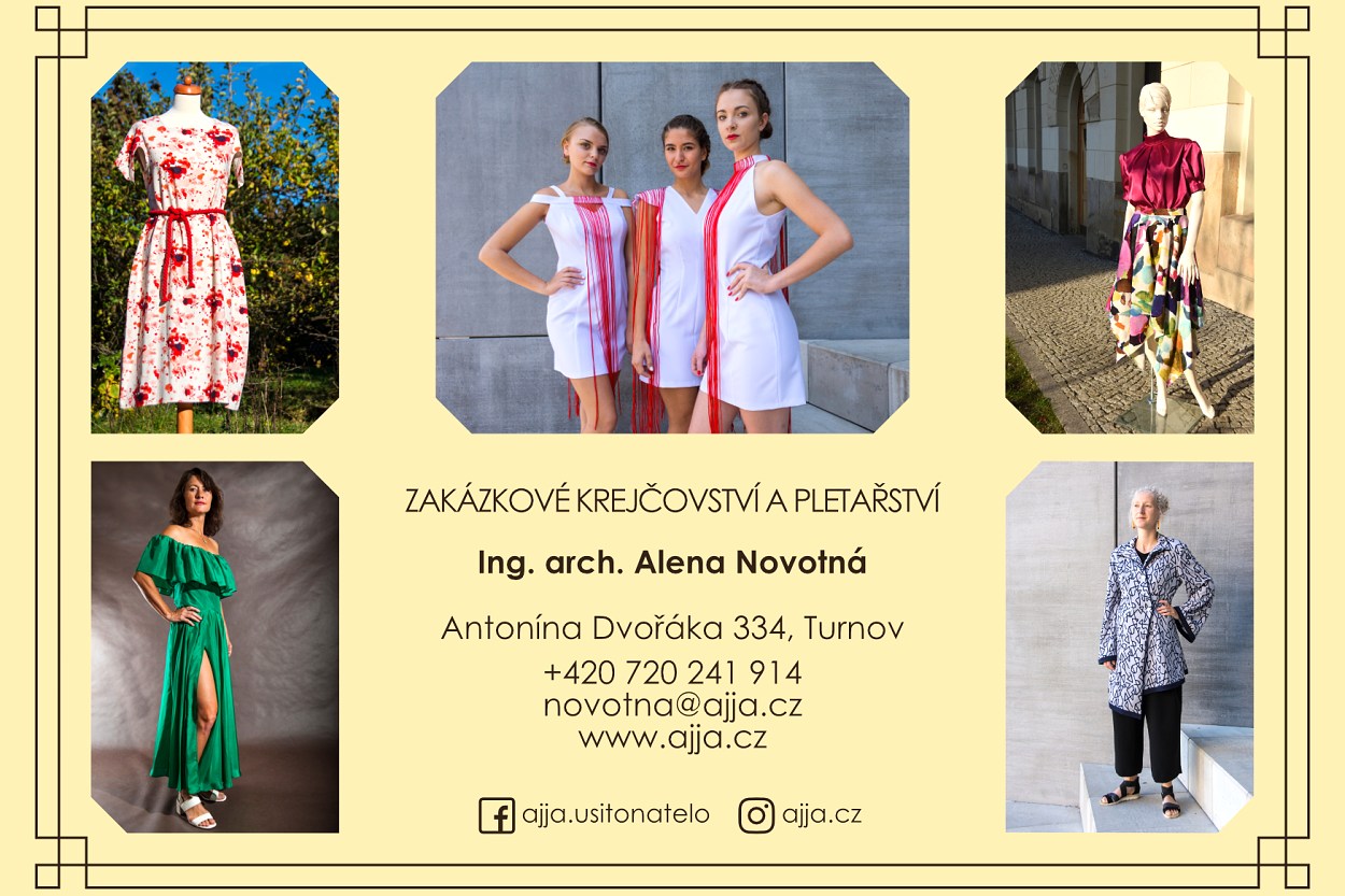 * DEN OTEVŘENÝCH DVEŘÍ zakázkového krejčovství a pletařství pod značkou AjjA. V sobotu 1. července oslaví Ing. arch. Alena Novotná dva roky od otevření provozovny. Den otevřených dveří se koná v novém salonu v Uličce řemesel pod turnovskou radnicí od 10.00 do 16.00 hodin. Budete si moci vyzkoušet sublimační tisk a vytvořit si originální potisk trička. Můžete si přinést i vlastní digitální předlohu.