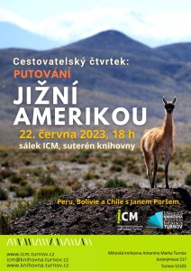 * CESTOVATELSKÝ ČTVRTEK: PUTOVÁNÍ JIŽNÍ AMERIKOU. Krásy a památky Peru, Bolívie a Chile v cestopisném promítání a besedě s Janem Poršem. Hlavní budova knihovny v Jeronýmově ulici, sálek ICM, začátek v 18.00 hodin.