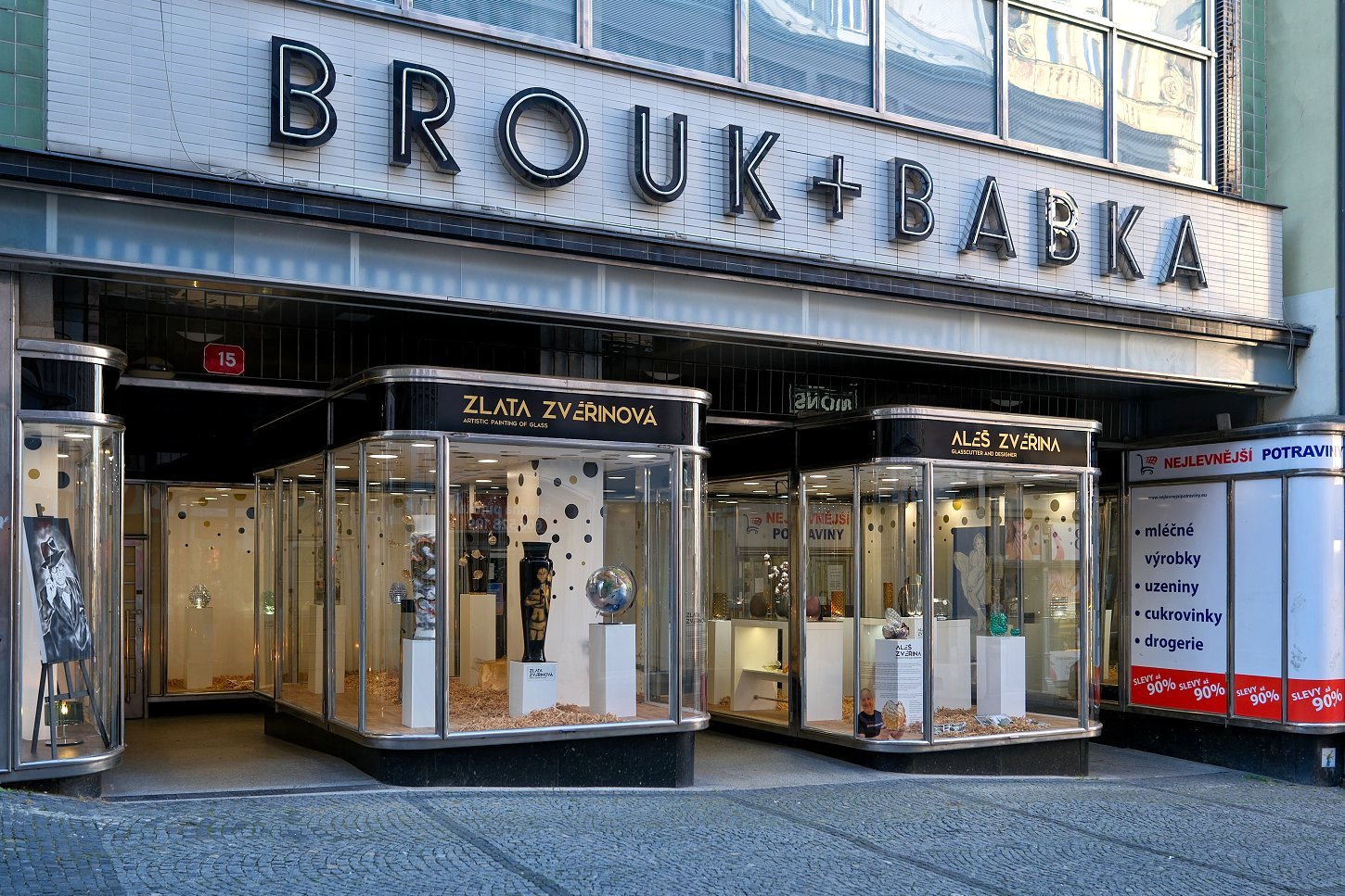 Expozice Aleše a Zlaty Zvěřinových zaplnila výlohy funkcionalistického obchodního domu Brouk+Babka v Pražské ulici v centru Liberce.