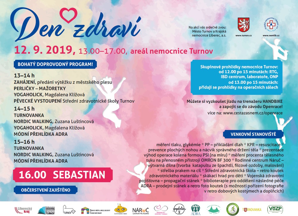 Město Turnov a Krajská nemocnice Liberec srdečně zvou na Den zdraví, který se uskuteční ve čtvrtek 12. září v areálu Nemocnice Turnov. Letošním zaměřením je „pohyb nás baví“. Návštěvníci se mohou těšit na prohlídky nemocnice, bohatý doprovodný program, a to jak na venkovním stanovišti, tak uvnitř.