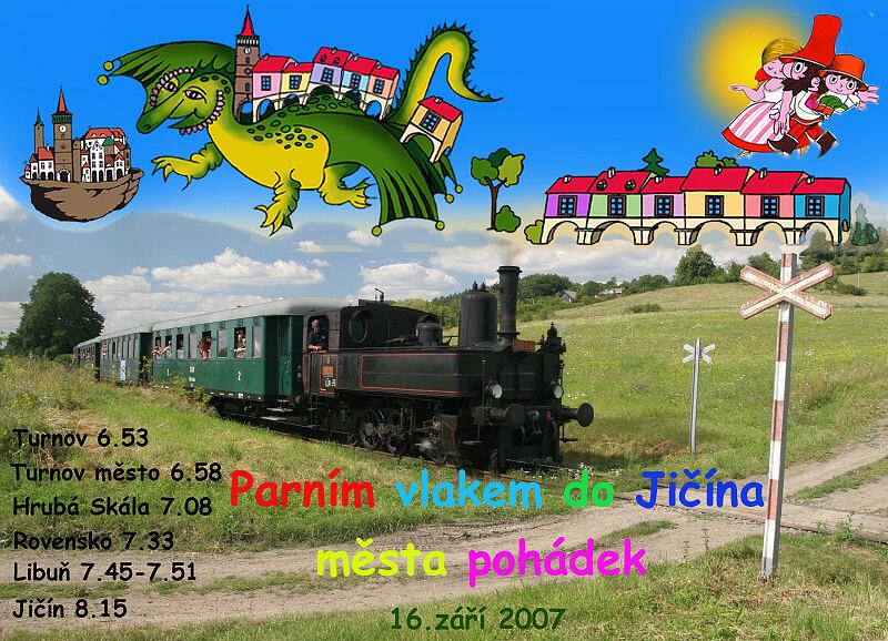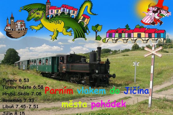► V neděli 16. září naposledy v tomto roce Českým rájem projede parní vlak tažení lokomotivou řady 310. Pojede na festival Jičín – město pohádky. Vlak odjíždí z turnovského nádraží už v 6.53 hodin, do Jičína přijede v 8.15 hodin. Odjíždí v 9.50 hodin – pohádková cesta vede do Libuně a Hrdoňovic, kam vlak přijede v 10.28 hodin. Odkud je plánován pěší výlet zpět do Jičína s řadou překvapení, která připravují jičínští skauti. Cesta vede do jeskyně s Rumcajsem, Mankou a Cipískem.