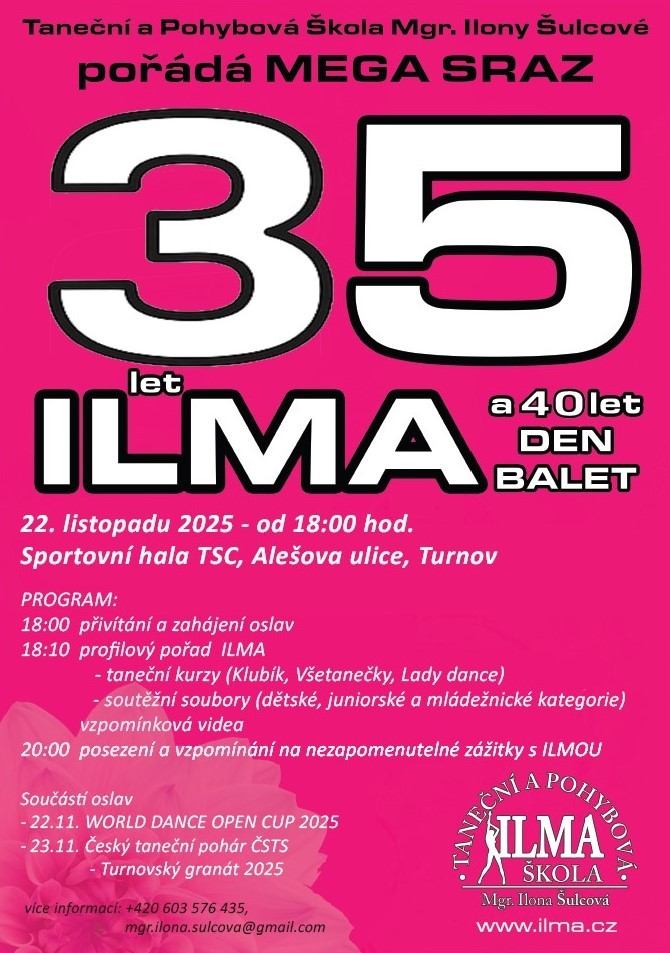 Oslavy výročí pojala ILMA netradičně – jako velký taneční víkend v plném profilu školy. Všichni milovníci tance, současní i bývalí členové ILMY, jsou zváni v sobotu 22. a v neděli 23. listopadu do Sportovní haly TSC v Turnově u nádraží. Očekává se vysoká návštěvnost, protože ILMA má na 40 tisíc (!) absolventů a mnozí z nich mají tanec v srdci dodnes.