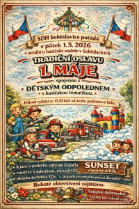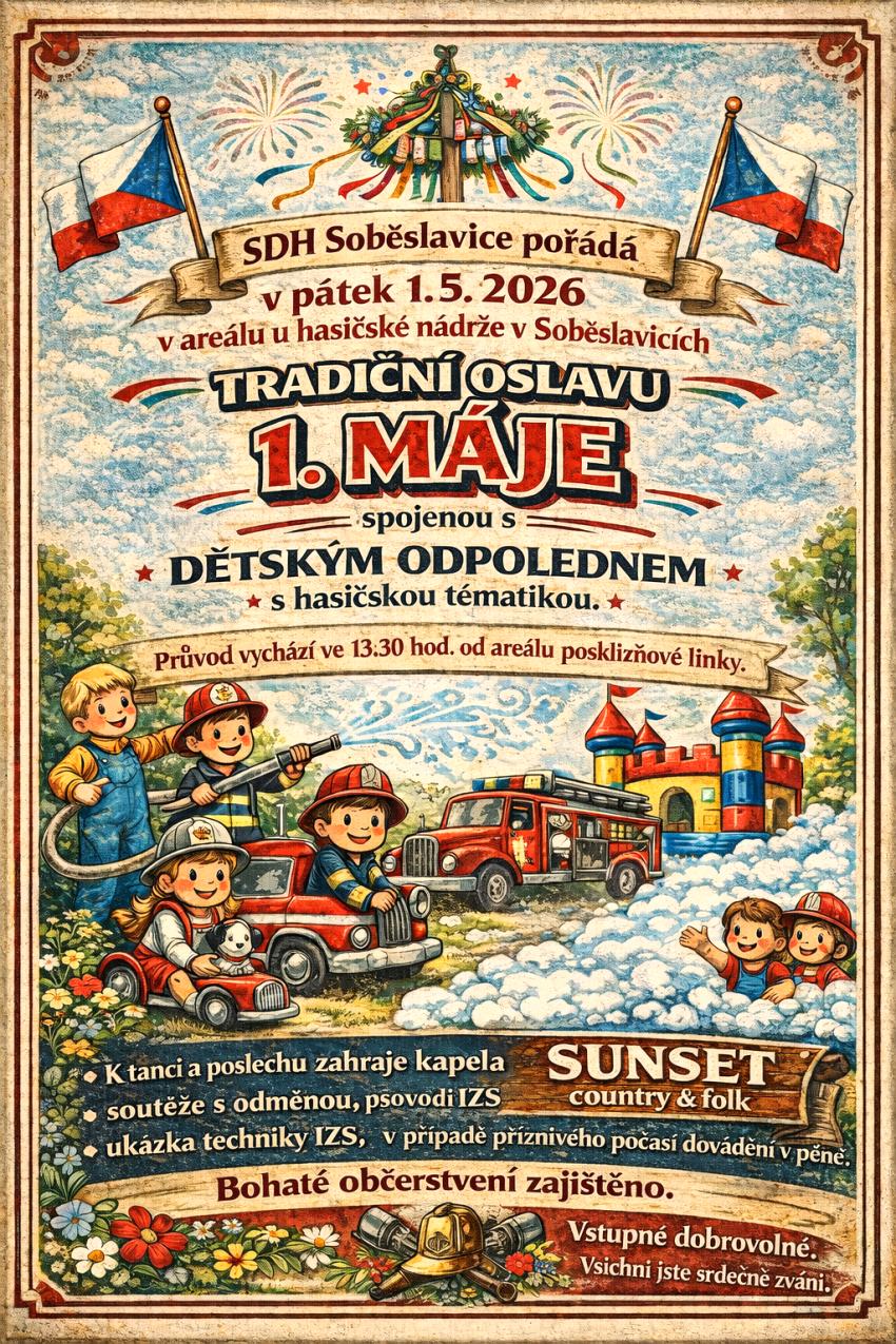 * OSLAVA 1. MÁJE A DĚTSKÉ ODPOLEDNE S HASIČSKOU TEMATIKOU V SOBĚSLAVICÍCH. Od 14.00 hodin k tanci a poslechu zahraje skupina Sunset z Mladé Boleslavi. Bohaté občerstvení zajištěno, vstupné dobrovolné. Pro děti soutěže, odměny, skákací hrad, ukázky techniky IZS, psovodi, dle počasí dovádění v pěně. Tradiční prvomájový průvod vychází ve 13.30 hodin od areálu posklizňové linky. Pořadatelem je SDH Soběslavice.