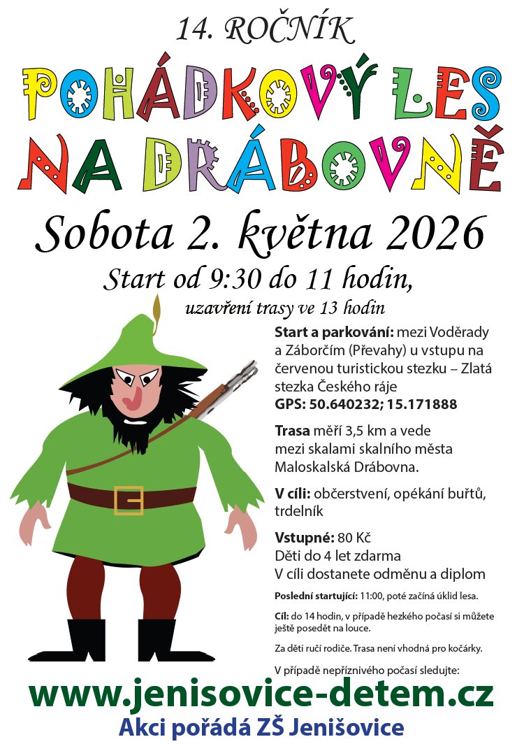 * POHÁDKOVÝ LES NA DRÁBOVNĚ. Start od 9.30 do 11.00 hodin mezi Voděrady a Záborčím na Drábovně u Malé Skály. Přijďte s dětmi za postavičkami z oblíbených pohádek a večerníčků, udělejte si hezký rodinný výlet mezi skalami Českého ráje s nádhernými výhledy a užijte si společně zábavu. Více informací na www.jenisovice-detem.cz.