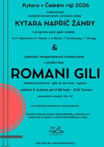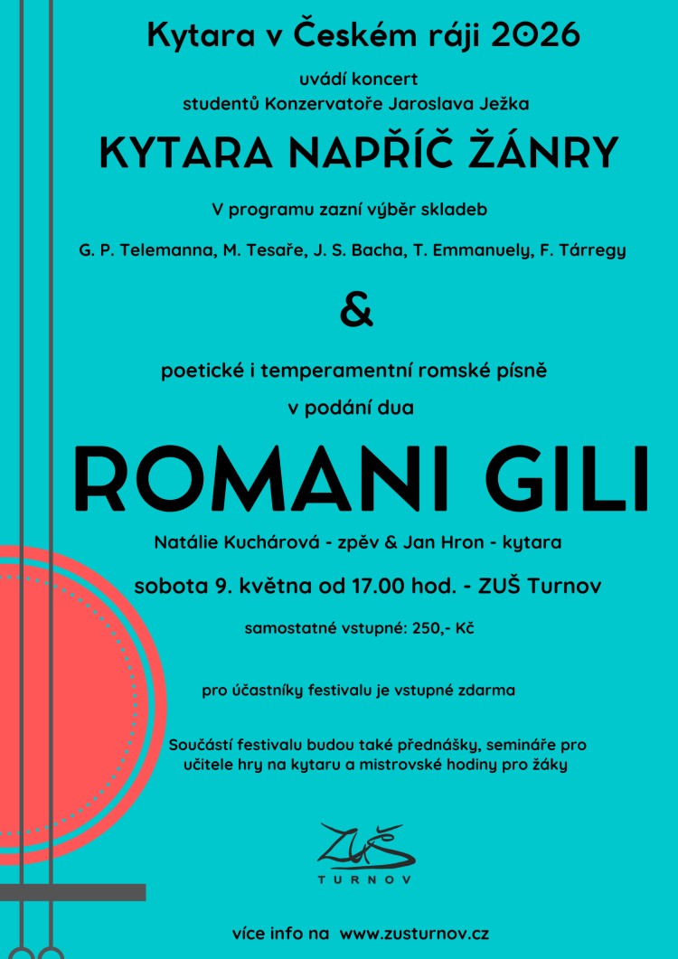 Od 17.00 hodin se v koncertním sále ZUŠ Turnov uskuteční koncert Kytara napříč žánry. Vystoupí studenti Konzervatoře Jaroslava Ježka s pestrým programem a duo Romani Gili – Natálie Kuchárová (zpěv) a Jan Hron (kytara), interpretující poetické i temperamentní romské písně. Samostatné vstupné na koncert je 250 Kč.