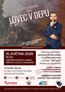 * LOVEC V DEPU. Talkshow s lovcem Jakubem Kvášovským alias kalkulátorem z pořadu „Na lovu“ moderuje Pavel Petr. Turnovské lokomotivní depo od 18.30 hodin. Vstupné 100 Kč. Hudební vystoupení – jazzové Duo caravan. Pořádá Klubu přátel železnic Českého ráje.