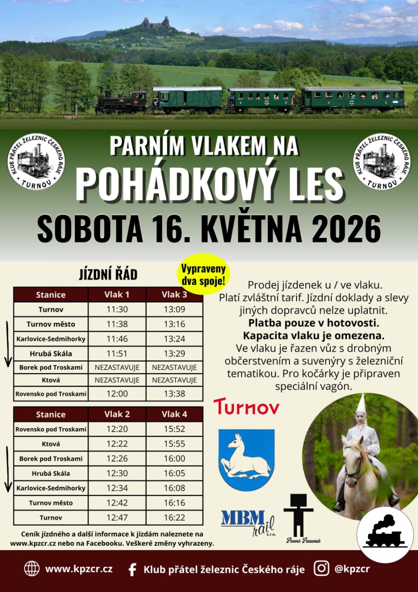* Parním vlakem na POHÁDKOVÝ LES do Rovenska pod Troskami. Z Turnova vlaky vyjíždějí v 11.30 a v 13.09 hodin, zpět z Rovenska jedou ve 12.20 a 15.52 hodin. Více na www.kpzcr.cz.