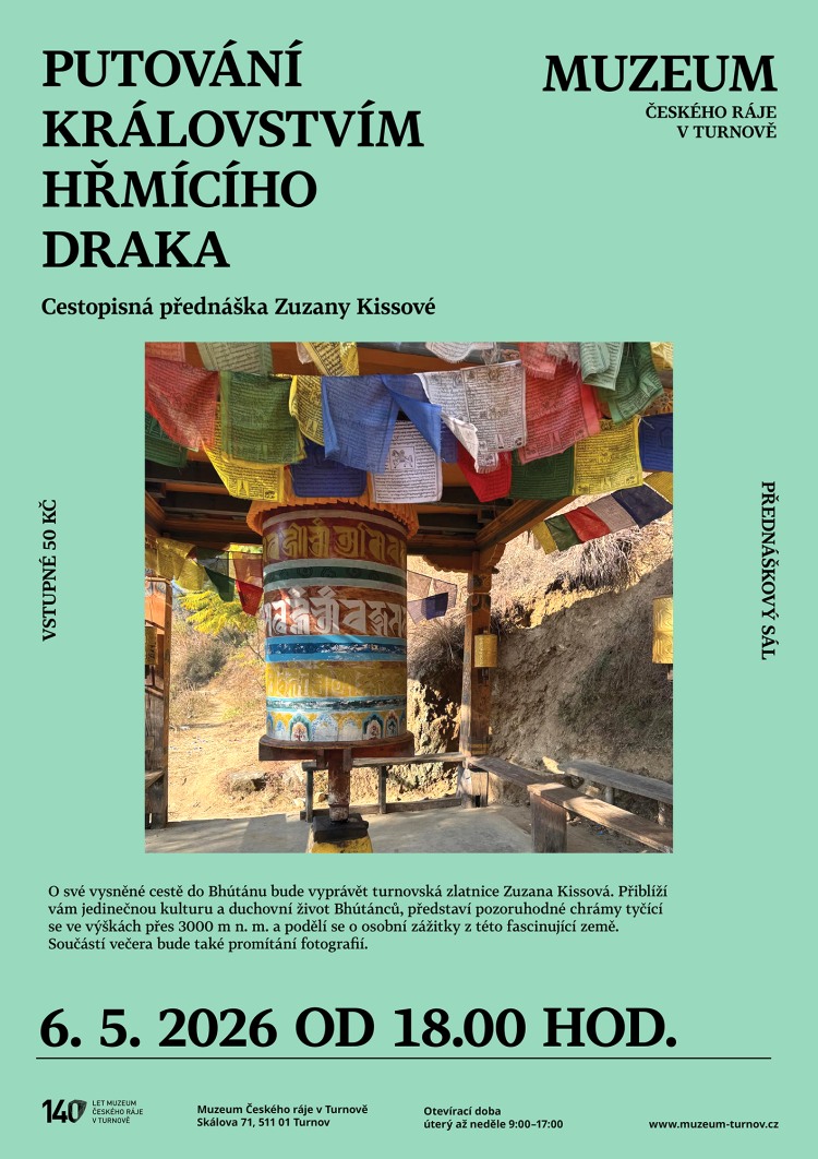 * PUTOVÁNÍ KRÁLOVSTVÍM HŘMÍCÍHO DRAKA. O své vysněné cestě do Bhútánu bude vyprávět turnovská zlatnice Zuzana Kissová. Přiblíží vám jedinečnou kulturu a duchovní život Bhútánců, představí pozoruhodné chrámy tyčící se ve výškách přes 3000 m n. m. a podělí se o osobní zážitky z této fascinující země. Součástí večera bude také promítání fotografií. Muzeum Českého ráje v Turnově, přednáškový sál, začátek v 18.00 hodin, vstupné 50 Kč.