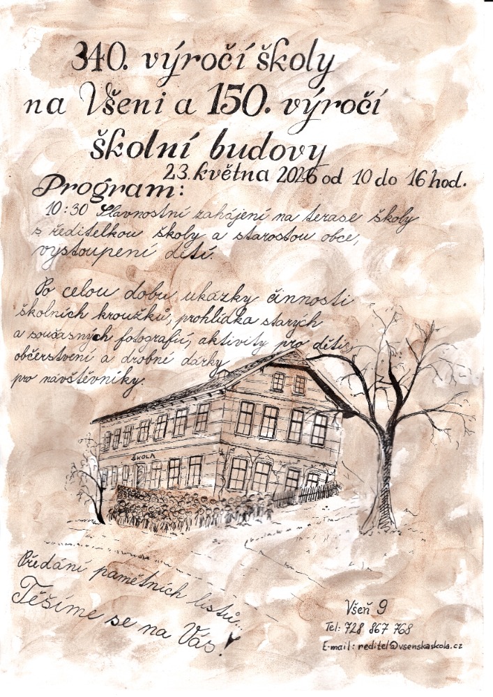 * 340. VÝROČÍ ŠKOLSTVÍ NA VŠENI A 150. VÝROČÍ ŠKOLNÍ BUDOVY. Slavnostní zahájení na terase školy proběhne v 10.30 hodin. Od 10.00 do 16.00 hodin bude škola přístupná pro veřejnost – ukázky z činnosti kroužků, prohlídka dobových i současných fotografií a kronik, aktivity pro děti. Občerstvení a drobné dárky pro návštěvníky.