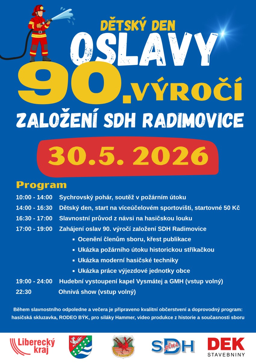 * DĚTSKÝ DEN A OSLAVY 90. VÝROČÍ ZALOŽENÍ SDH RADIMOVICE. Od 14.00 soutěž v požárním sportu o Sychrovský pohár, od 14.00 hodin dětský den na víceúčelovém sportovním hřišti, od 16.30 hodin slavnostní průvod z návsi na hasičskou louku, která se nachází před zámkem Sychrov. Od 17.00 hodin proběhnou oficiální oslavy – proslovy hostů, krátké připomenutí historie sboru, předání ocenění členům sboru, křest publikace o historii sboru a další. Následovat budou ukázky požárního sportu a moderní techniky. Od 19.00 hodin vystoupení kapel Vysmátej a GMH, akci ukončí ve 22.30 hodin ohňová show.