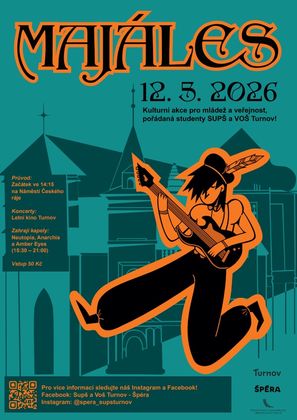 * MAJÁLES. Turnov znovu ožije mladistvou energií. Studující SUPŠ a VOŠ Turnov připravují tradiční jarní oslavu všech školou povinných – Majáles. Tuto celodenní akci propojí program pro děti, tradiční průvod městem i večerní koncerty v letním kině. Turnovský Majáles se odehraje na několika místech v centru města a je otevřen široké veřejnosti za symbolické vstupné.