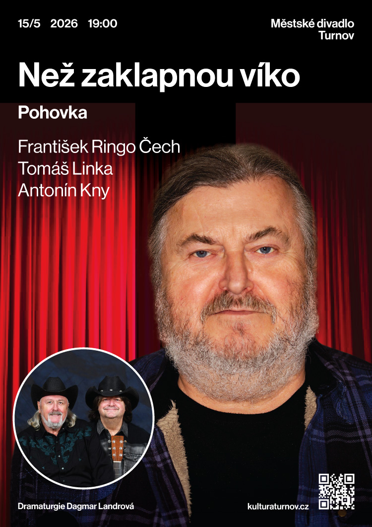 * POHOVKA: NEŽ ZAKLAPNOU VÍKO. Vtipný pohled na život i na to, co je po něm, od jednoho z nejoriginálnějších umělců naší doby – Františka Ringa Čecha. Ten je mimo jiné také výjimečný výtvarník a textař, autor mnoha hudebních hitů. Během večera bude Ringo promítat své nejlepší originální obrazy a vtipně je komentovat. Jeho one man show je proložena písněmi kamaráda, skvělého country zpěváka a hráče na foukací harmoniku Tomáše Linky a kytaristy Antonína Kny. Oba byli členy legendární skupiny Fešáci. Pohovka/talkshow, městské divadlo od 19.00 hodin, základní vstupné 350 Kč.