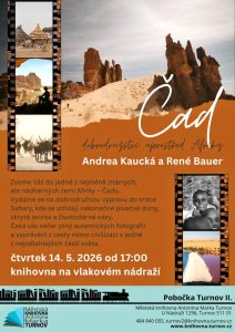 * ČAD: DOBRODRUŽSTVÍ UPROSTŘED AFRIKY. Zveme vás do jedné z nejméně známých, ale nádherných částí Afriky – Čadu. Vydáme se na dobrodružnou výpravu do srdce Sahary, kde se střídají nekonečné písečné duny, skrytá jezírka a životodárné oázy. Objevíme krásy pohoří Ennedi, podíváme se k legendárnímu jezeru Ounianga a potkáme i kočovné obyvatele magické pouště. Čeká vás večer plný autentických fotografií, vyprávění z cesty mimo civilizaci a nevšedních zážitků včetně překonávání logistických výzev z jedné z nejodlehlejších částí světa. O své zážitky se podělí cestovatelé Andrea Kaucká a René Bauer. Knihovní pobočka na vlakovém nádraží od 17.00 hodin.