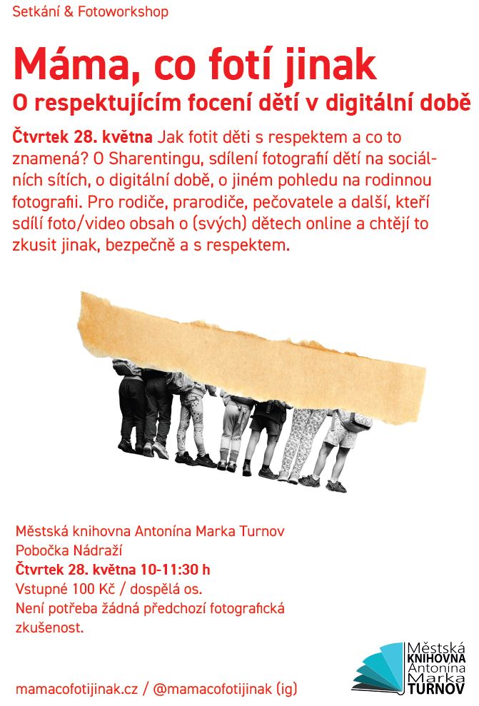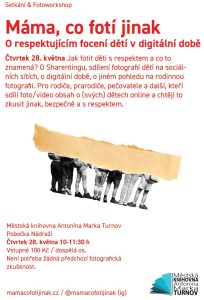 * NETRADIČNÍ BABYCLUB VAGÓNEK: MÁMA, CO FOTÍ JINAK. O tom, jak fotografovat děti s respektem se přijde podělit úplně první host Vagónku Anna Nováková, která se dlouhodobě věnuje tématu sharentingu. Setkání nejen pro účastníky babyclubu, a nejen pro rodiče, ale všechny, kteří sdílí obsah o dětech on-line a chtěli by to třeba zkusit jinak. Účast s dětmi je vítána. Příspěvek 100 Kč na dospělou osobu. Knihovní pobočka na vlakovém nádraží od 10.00 hodin.
