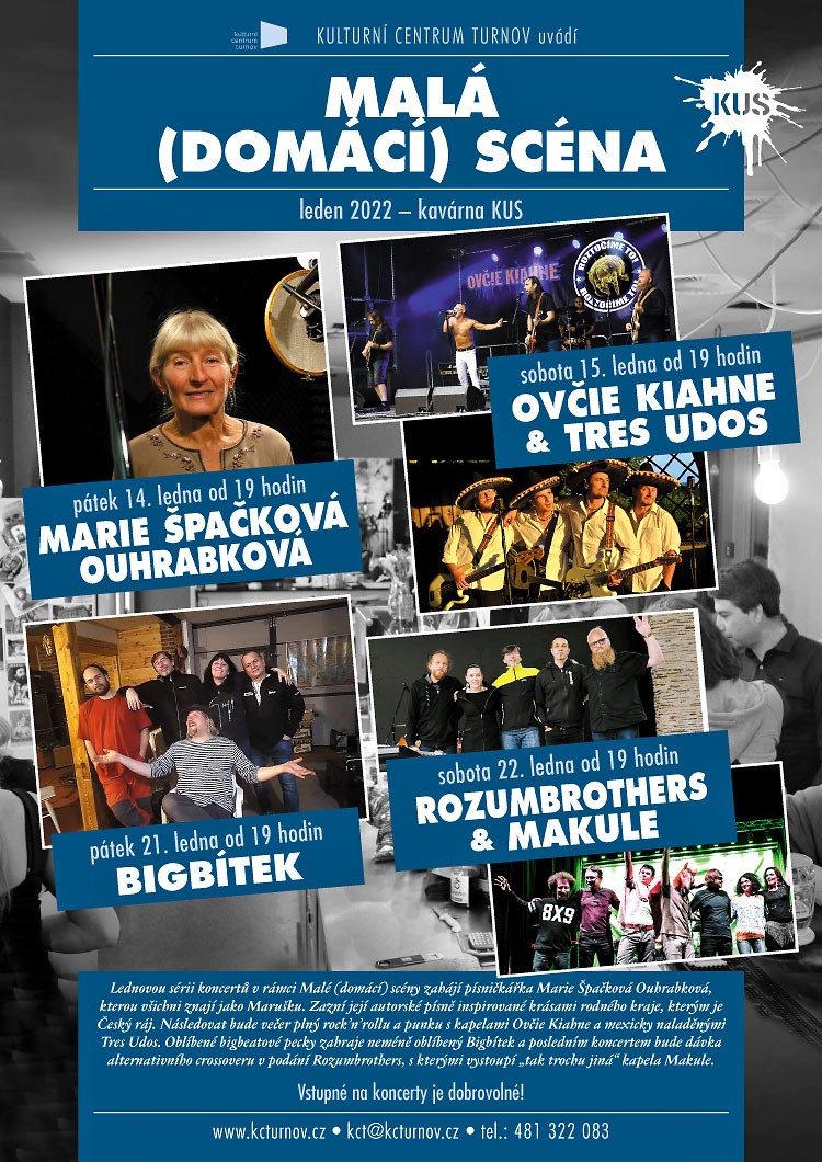Lednovou sérii koncertů v rámci Malé (domácí) scény zahájí písničkářka Marie Špačková Ouhrabková, kterou všichni znají jako Marušku. Zazní její autorské písně inspirované krásami rodného Českého ráje. Následovat bude večer plný rock’n’rollu a punku s kapelami Ovčie Kiahne a mexicky naladěnými Tres Udos. Oblíbené bigbeatové pecky zahraje neméně oblíbený Bigbítek a posledním koncertem bude dávka alternativního crossoveru v podání Rozumbrothers, s kterými vystoupí „tak trochu jiná“ kapela Makule.