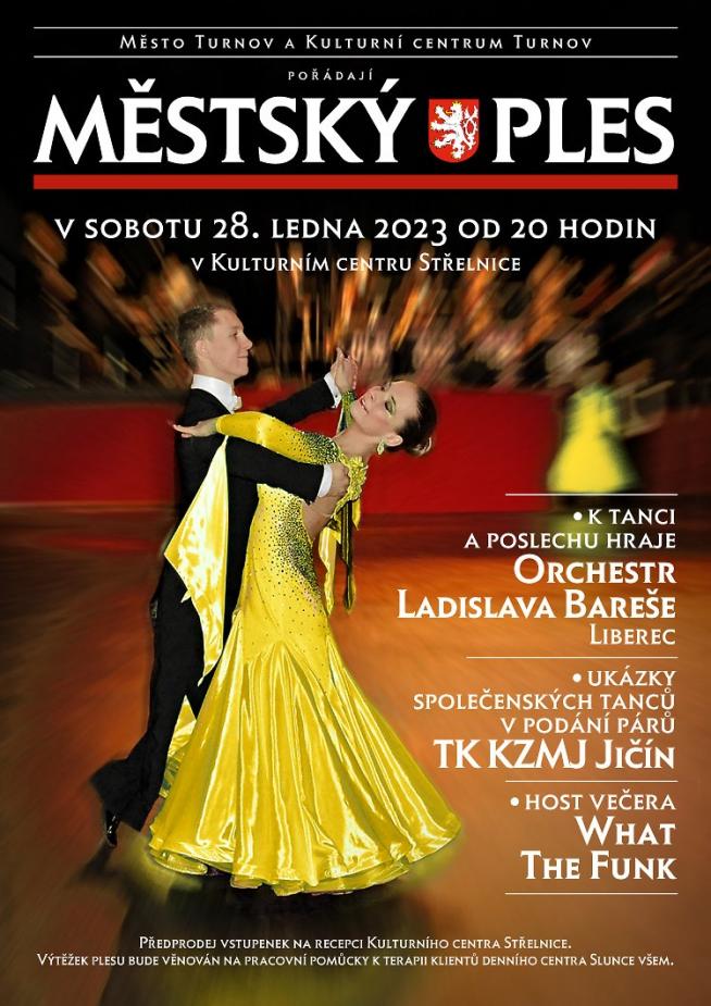 * XII. MĚSTSKÝ PLES. K tanci a poslechu hraje Orchestr Ladislava Bareše, po půlnoci What The Funk. Své taneční umění v průběhu večera předvedou tanečníci TK TZMJ Jičín. Výtěžek plesu bude věnován na pomůcky klientů Centra denních služeb Slunce všem. Střelnice od 20.00 hodin, vstupenky k dostání na recepci KC Střelnice za 260 Kč.