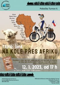 * NA KOLE PŘES AFRIKU. Jako šestadvacetiletý se Tadeáš Šíma z Prachatic vydal na sólovou expedici přes Afriku a přejel celý kontinent od severu až na jih. V roce 2016 vyjel na kole z Prachatic s cílem došlapat do Kapského Města v Jihoafrické republice. Ovšem jeho cesta skončila už v Maroku, kde ho parta zlodějů připravila o kolo. O rok později však vyrazil znovu, tentokrát z marockého města Tangier a do Kapského Města nakonec dorazil. Během sedmi měsíců ujel na kole 13 tisíc kilometrů a navštívil 15 států černého kontinentu. Povídání o tom, jak bolí zadek po půl roce na kole, o strachu ze tmy, jak chránit slony v Kongu, nebo jak se chytá slepice kolem jezírka s krokodýly. K dostání bude také jeho kniha Na kole přes Afriku. Turnov II – knihovna na vlakovém nádraží, začátek v 17.00 hodin.