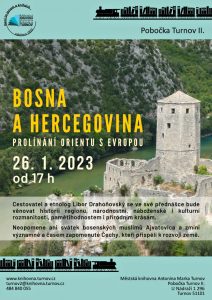 * BOSNA A HERCEGOVINA, PROLÍNÁNÍ ORIENTU S EVROPOU. Cestovatel a etnolog Libor Drahoňovský se ve své přednášce bude věnovat historii regionu, národnostní, náboženské i kulturní rozmanitosti, pamětihodnostem i přírodním krásám. Součástí pořadu je také dokument o Ajvatovici, nejvýznamnějším svátku muslimských Bosňáků. Rovněž nejsou opomenuti ani významní i časem zapomenutí Češi, kteří v Bosně a Hercegovině působili a přispěli k jejímu rozvoji, případně se zasloužili o její zdokumentování. Za všechny jmenujme malíře Ludvíka Kubu, fotografa Františka Topiče a architekta Karla Paříka, který svými projekty staveb obohatil především metropoli Sarajevo o mnohé hodnotné a slavné budovy. Turnov II – knihovna na vlakovém nádraží, začátek v 17.00 hodin.