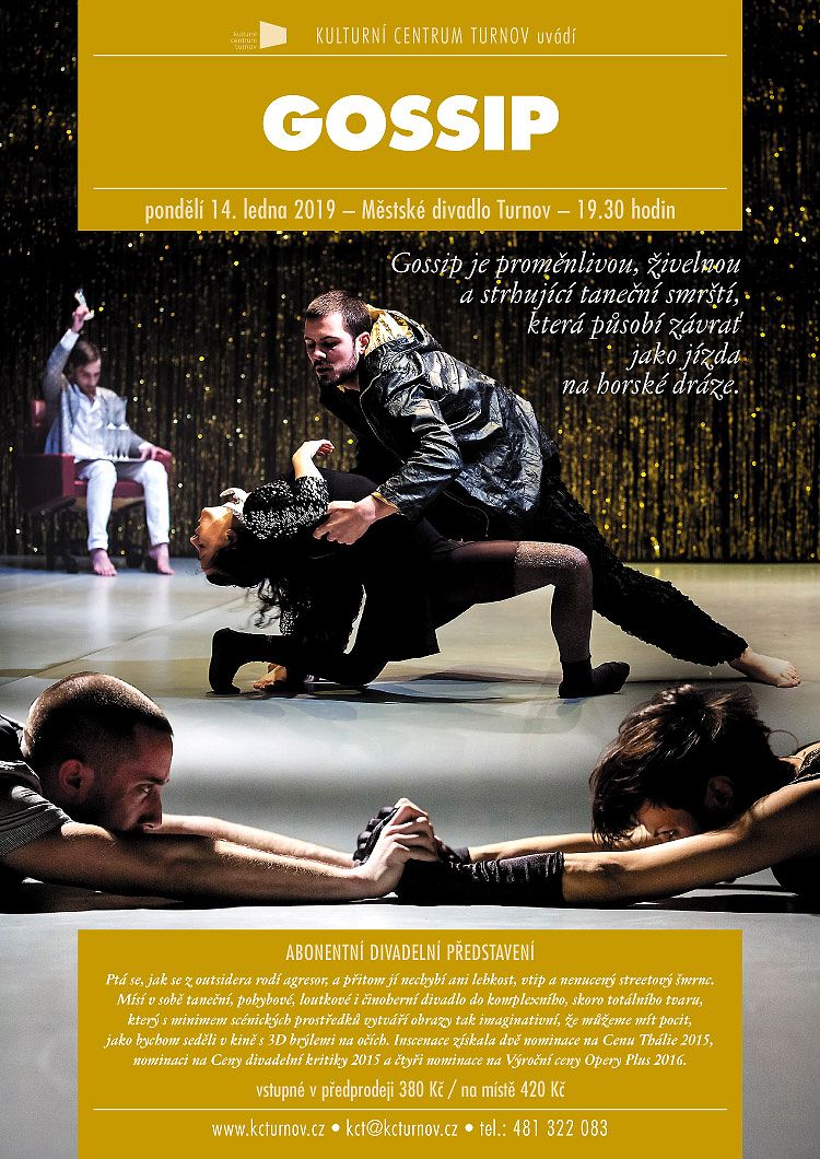 * GOSSIP. Gossip, je proměnlivou živelnou a strhující taneční smrští, která působí závrať jako jízda na horské dráze. Mísí v sobě taneční, pohybové, loutkové i činoherní divadlo do komplexního, skoro totálního tvaru, který s minimem scénických prostředků vytváří obrazy tak imaginativní, že můžeme mít pocit, jako bychom seděli v kině s 3D brýlemi na očích – ovšem s tou výhodou, že se na nás přitom přelévá energie živých tanečníků. Inscenace získala dvě nominace na Cenu Thálie 2015, nominaci na Cenu divadelní kritiky 2015 a čtyři nominace na Výroční ceny Opery Plus 2016. Abonentní divadelní představení. Městské divadlo Turnov od 19.30 hodin. Vstupné v předprodeji 380 Kč, na místě 420 Kč.