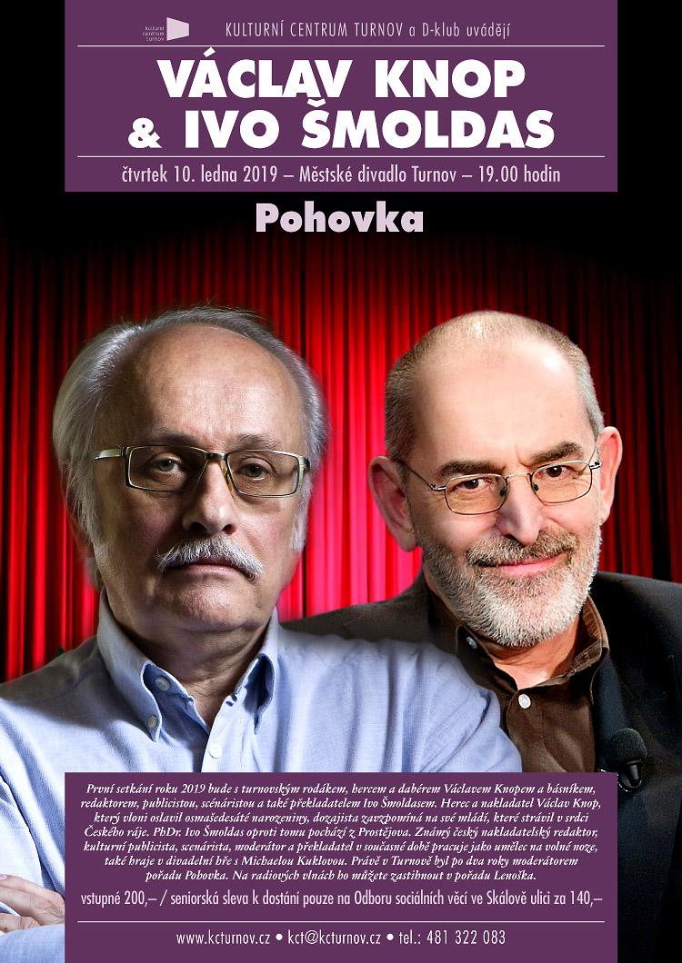 * VÁCLAV KNOP & IVO ŠMOLDAS. První setkání roku 2019 bude s turnovským rodákem, hercem a dabérem Václavem Knopem a básníkem, redaktorem, publicistou, scénáristou a také překladatelem Ivo Šmoldasem. Pohovka. Městské divadlo Turnov od 19 hodin. Vstupné 200 Kč, 140 Kč (seniorské vstupné na OSV).