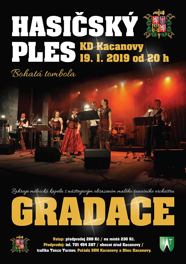 * HASIČSKÝ PLES. KD Kacanovy od 20.00 hodin. Hraje kapela Gradace, bohatá tombola. Vstupné 200 Kč, na místě 230 Kč. Předprodej na tel. 721 454 287 (OÚ Kacanovy) a trafika Tesco Turnov. Pořádají SDH Kacanovy a obec Kacanovy.