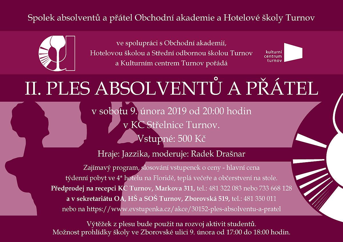 * II. PLES ABSOLVENTŮ A PŘÁTEL Obchodní akademie a Hotelové školy Turnov. Bohatá tombola – hlavní cena týdenní pobyt ve čtyřhvězdičkovém hotelu na Floridě v USA, večeře a občerstvení na stole v ceně. Zajímavý doprovodný program. Hraje Jazzika, moderuje Radek Drašnar. KC Střelnice od 20.00 hodin, vstupné 500 Kč. Předprodej v recepci KCT a v sekretariátu školy. Výtěžek z plesu bude použit na rozvoj aktivit studentů.