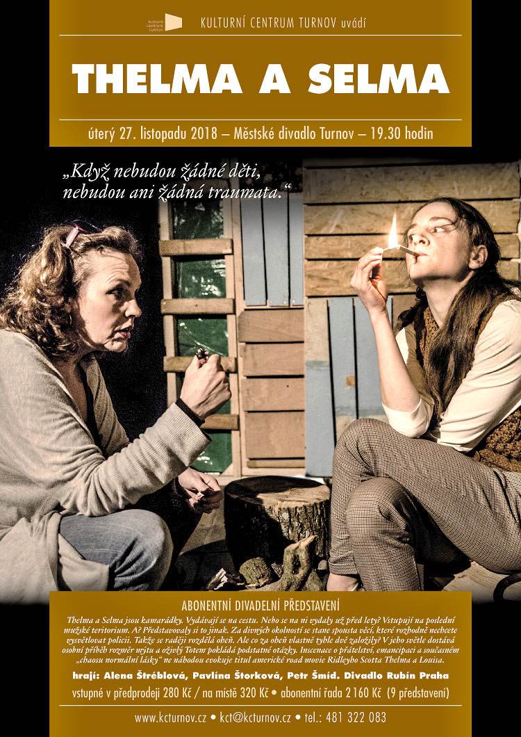 * THELMA A SELMA. Thelma a Selma se vydávají na cestu. Nebo se na ni vydaly už před lety? V hlavních rolích se představí Alena Štréblová a Pavlína Štorková. Abonentní divadelní představení. Městské divadlo Turnov od 19.30 hodin. Vstupné v předprodeji 280 Kč, na místě 320 Kč.