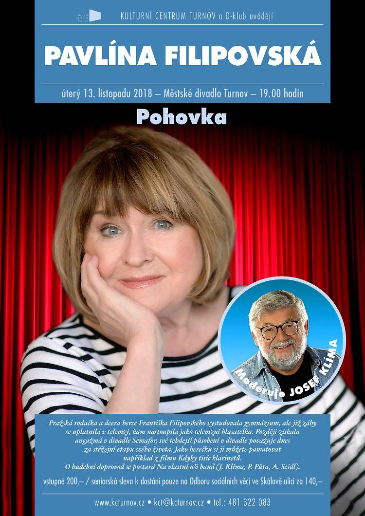 * PAVLÍNA FILIPOVSKÁ. Interpretka nezapomenutelné semaforské písně „Včera neděle byla“ bude hostem listopadového pořadu Pohovka. Povídat si s ní bude Josef Klíma. O hudební doprovod se postará Na vlastní uši band (J. Klíma, P. Půta, A. Seidl.). Městské divadlo Turnov od 19.00 hodin. Vstupné 200 Kč, 140 Kč seniorské vstupné na OSV.